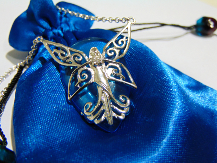 A híres angol fantasy designer, Anne Stokes által tervezett medál antiallergén fémötvözetből készült, ezüstözött, a kék kristály kézzel csiszolt.