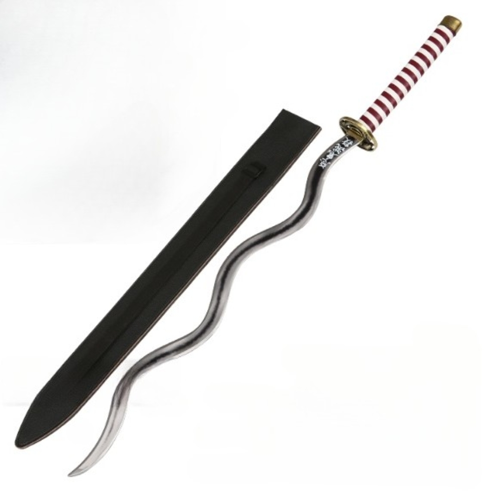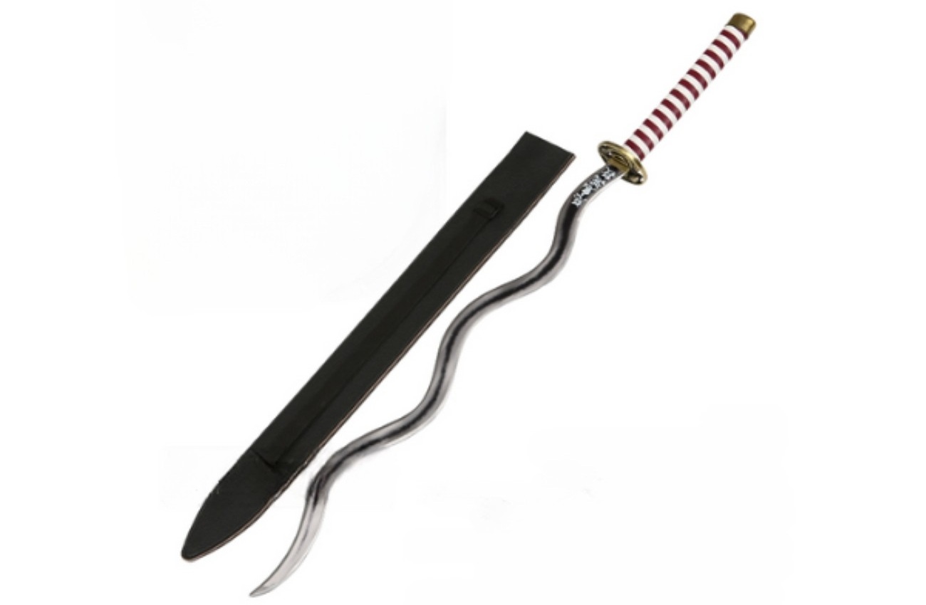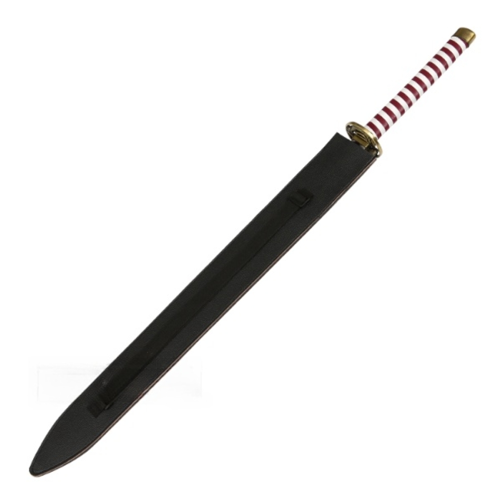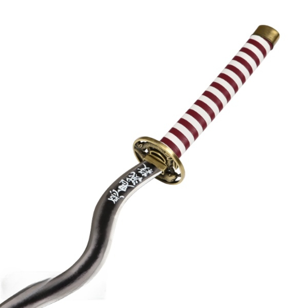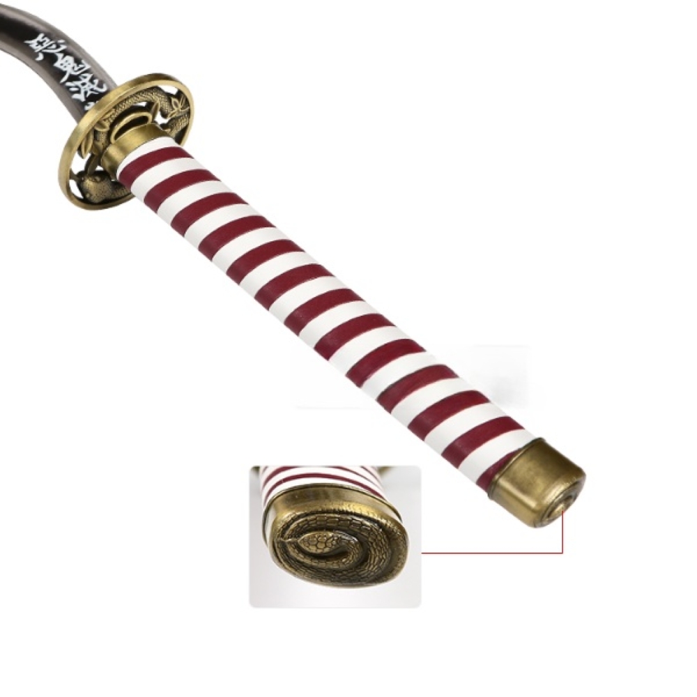 Feketített acél pengével készített díszkard, műbőr hüvellyel, fémötvözetből készült tsubával a Demon Slayer animéből.