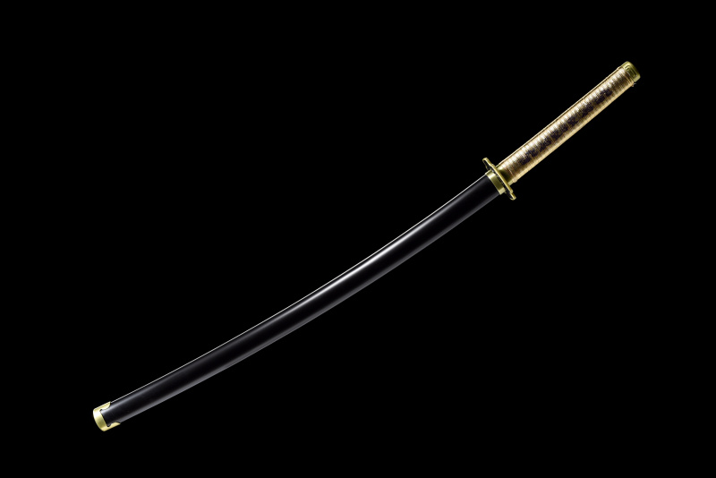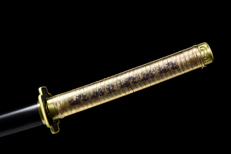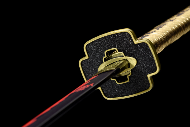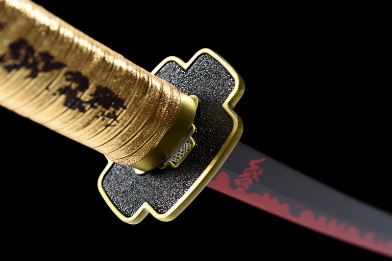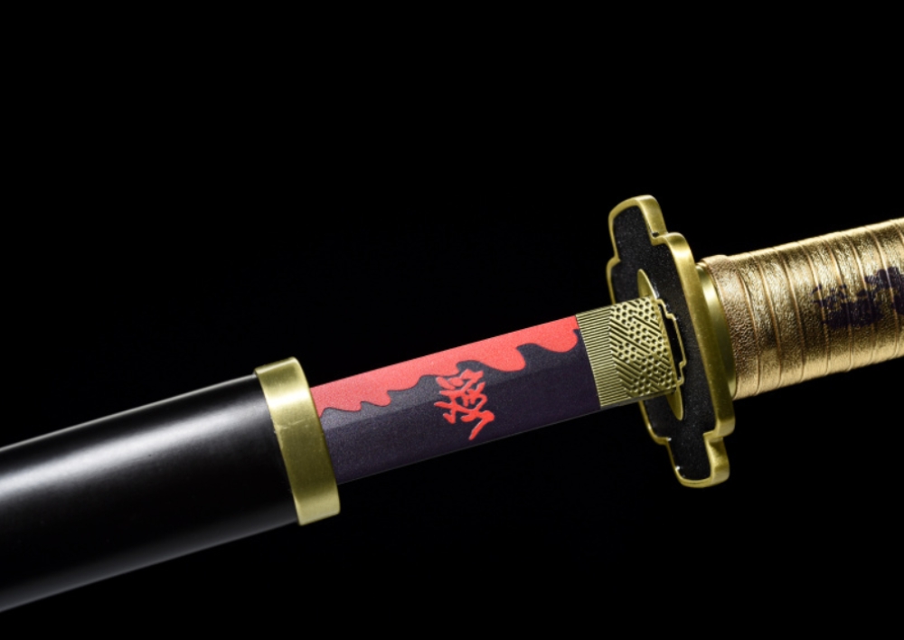 Fekete-piros pengével készített díszkard, fa kardhüvellyel, fémötvözetből készített tsubával a Demon Slayer sorozatból.