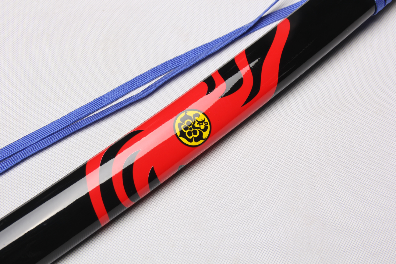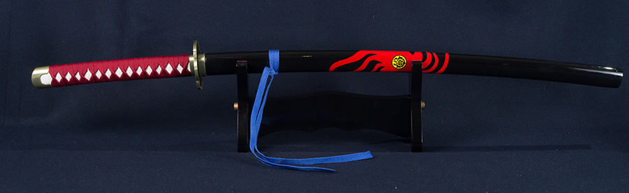 Feketített acélpengével készített díszkard, lakkozott és festett fa sayával, valamint fémötvözetből készült szerelékkel.