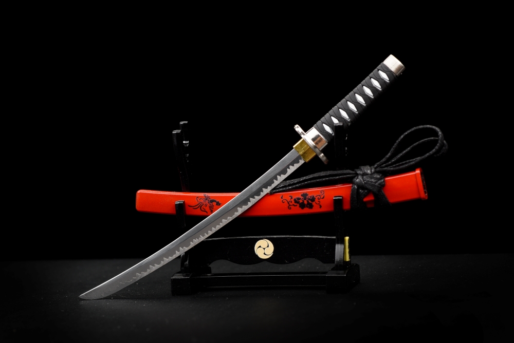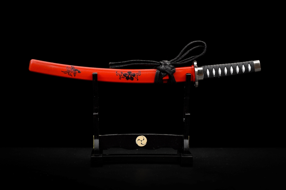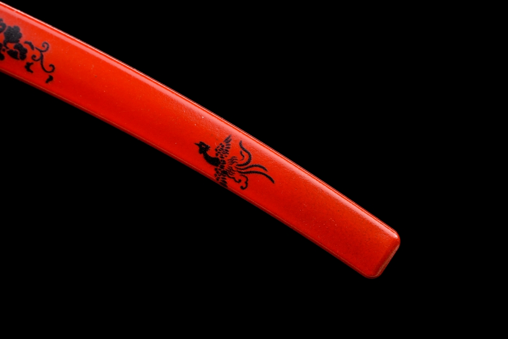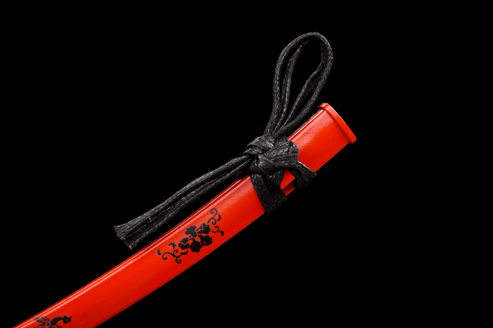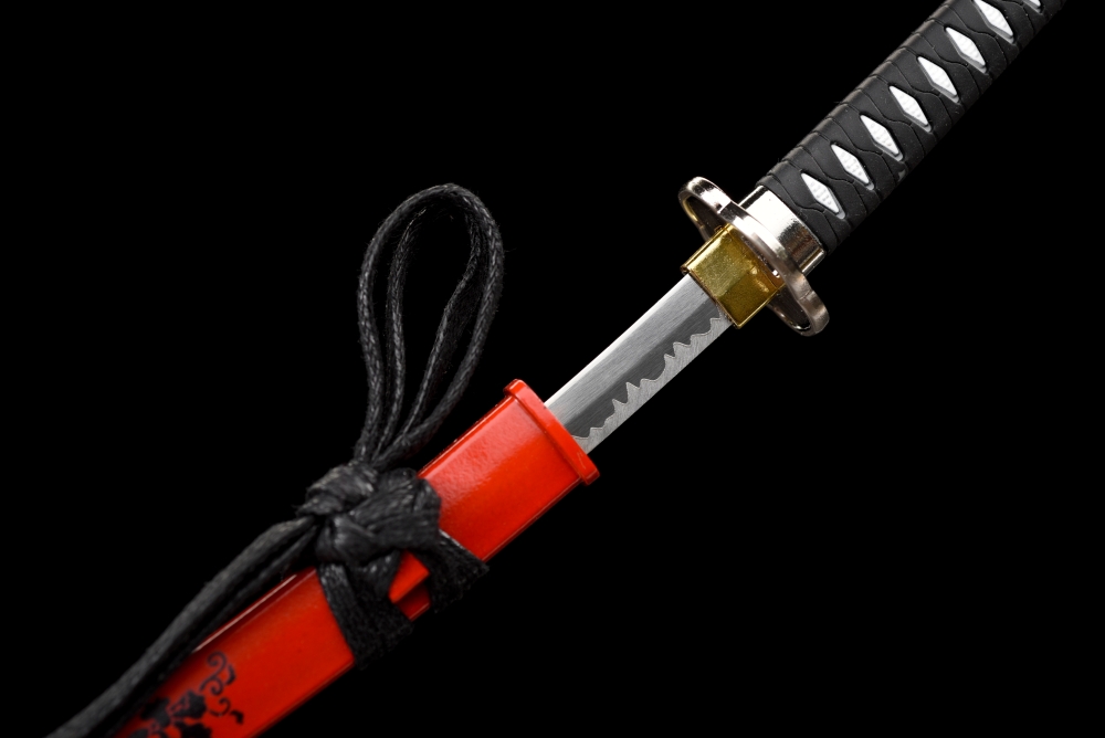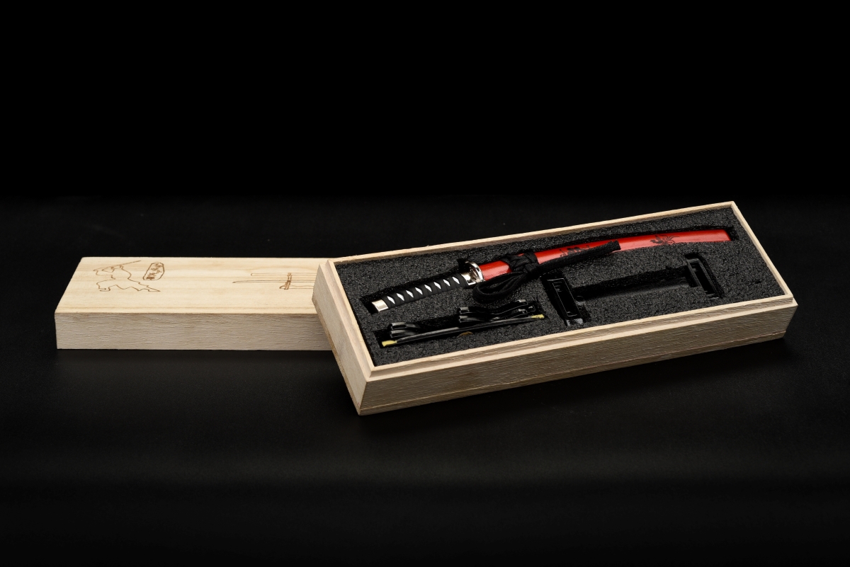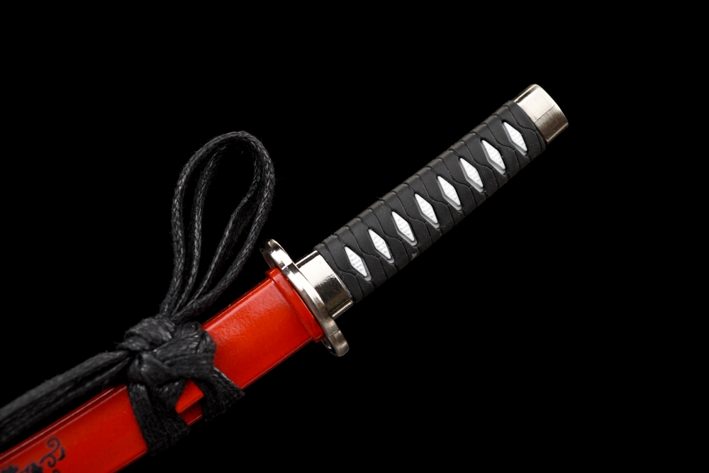 Rozsdamentes acél pengével készített levélbontó katana. A tsuba anyaga cink-alumínium öntvény, a markolat fekete, míg a hüvely pirosra festett műanyag.