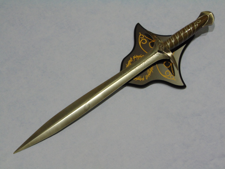 Rozsdamentes acélpengével készített díszkard, festett fa tartóval.
