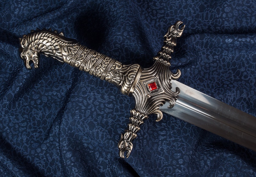 Díszkard rozsdamentes acélpengével és fémötvözet szerelékkel a Trónok Harca sorozatból. Az ár tartalmazza a képen látható festett fali tartót is. A kard súlya: 1425 gramm.