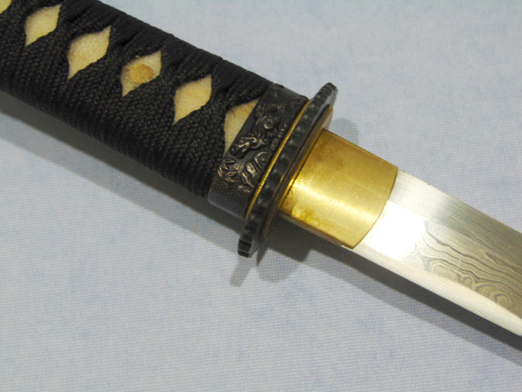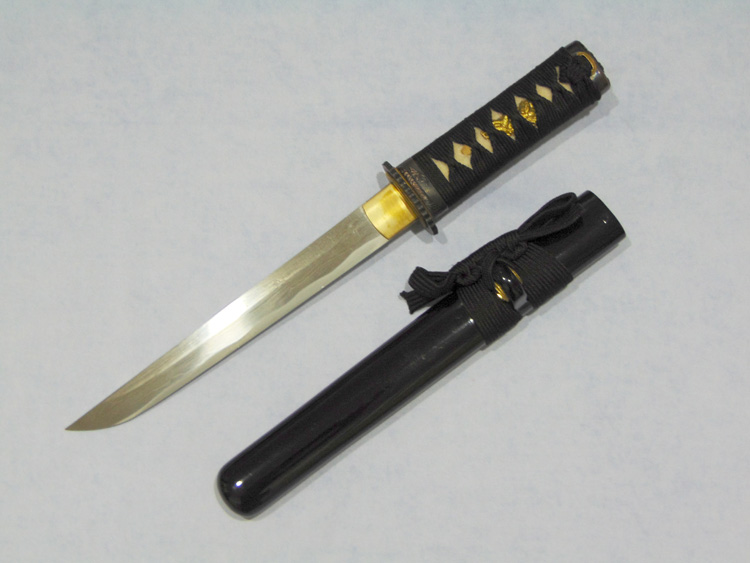 Damaszkolt acélból készített, élezett japán tőr. A tsuba acél, a markolat rájabőr és pamut borítású. A fa díszdobozban kínált tőr egy jó ajándékötlet a japán fegyverek rajongóinak.