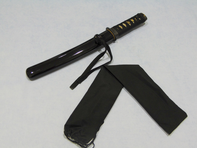 További adatok:- pengehossz: 24 cm- saya: lakkozott fa- tsuba: acél- tsukaito: pamut, alatta rájabőr