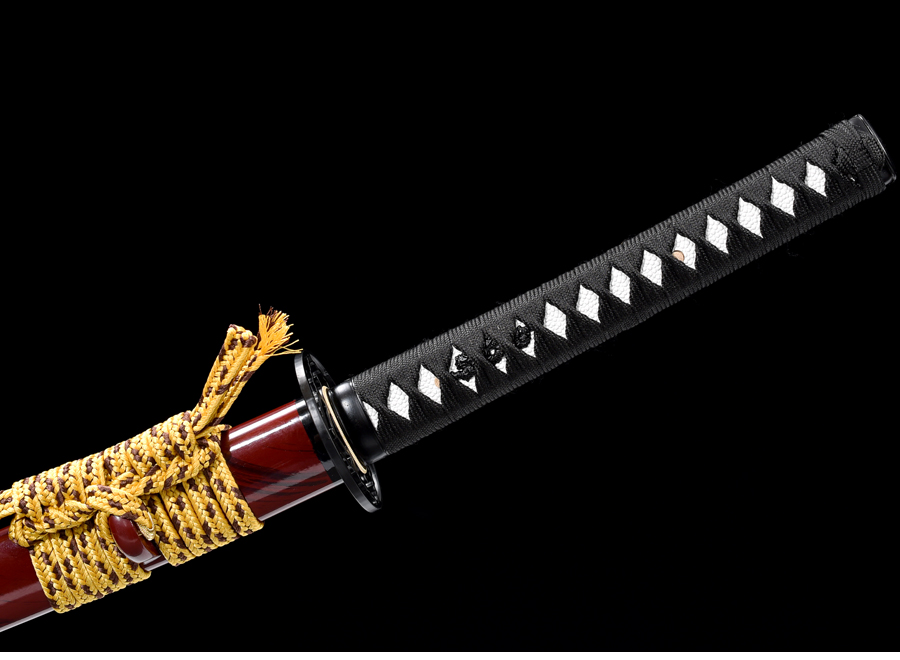 Rétegelt kovácsolással (damaszkolás), 1060 típusú szénacélból készült katana. A kard vágógyakorlatra nem alkalmas!