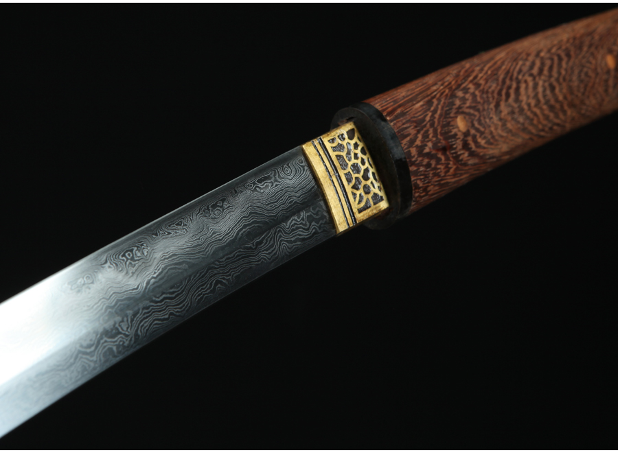 Rétegelt kovácsolással (damaszkolás), 1060-as szénacélból, hagyományos agyagos kitakarással edzett, valódi hamonnal készített shirasaya. A kézzel élezett és polírozott penge borotvaéles, vágógyakorlatra (tameshigiri) alkalmas!