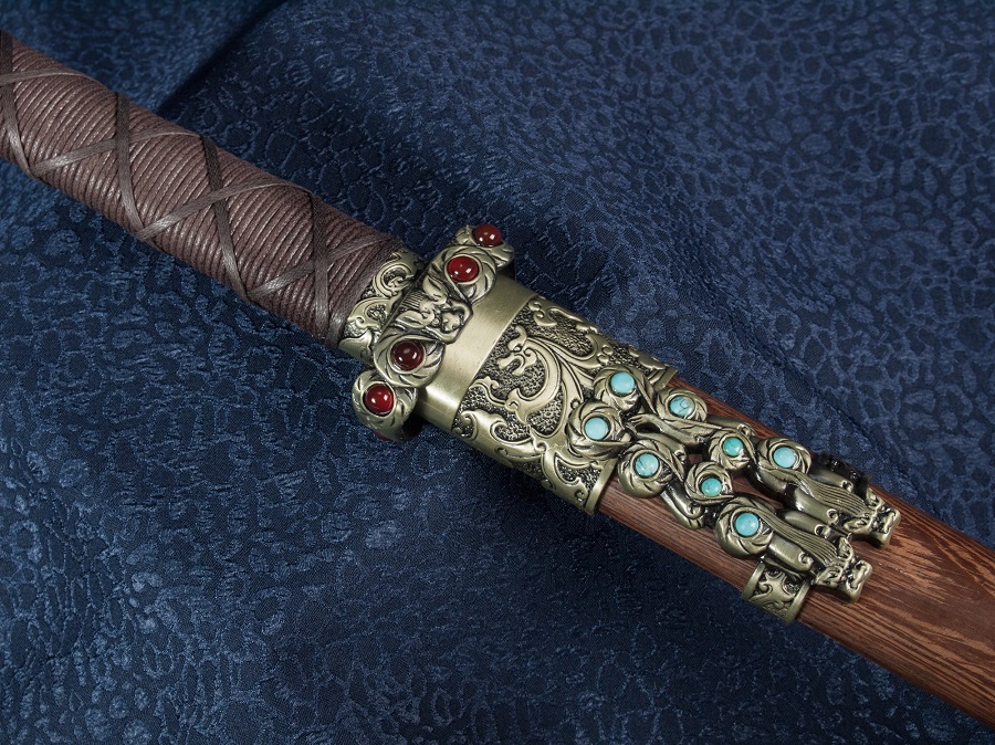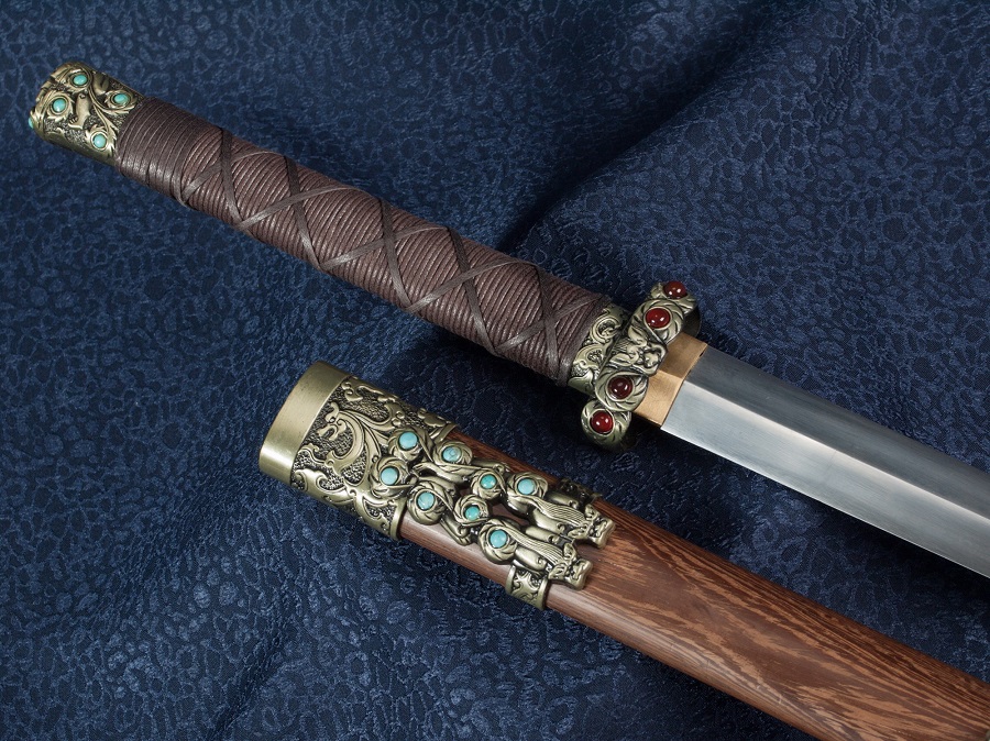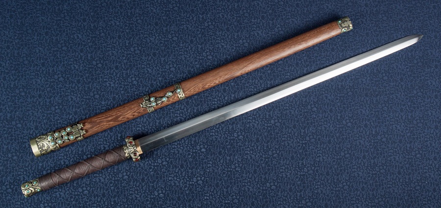 1045-ös acélból kovácsolt egyenes kard, élezett pengével, bőrrel befont markolattal, díszes szerelékekkel és festett fából készült kardhüvellyel. Díszdobozzal adjuk.