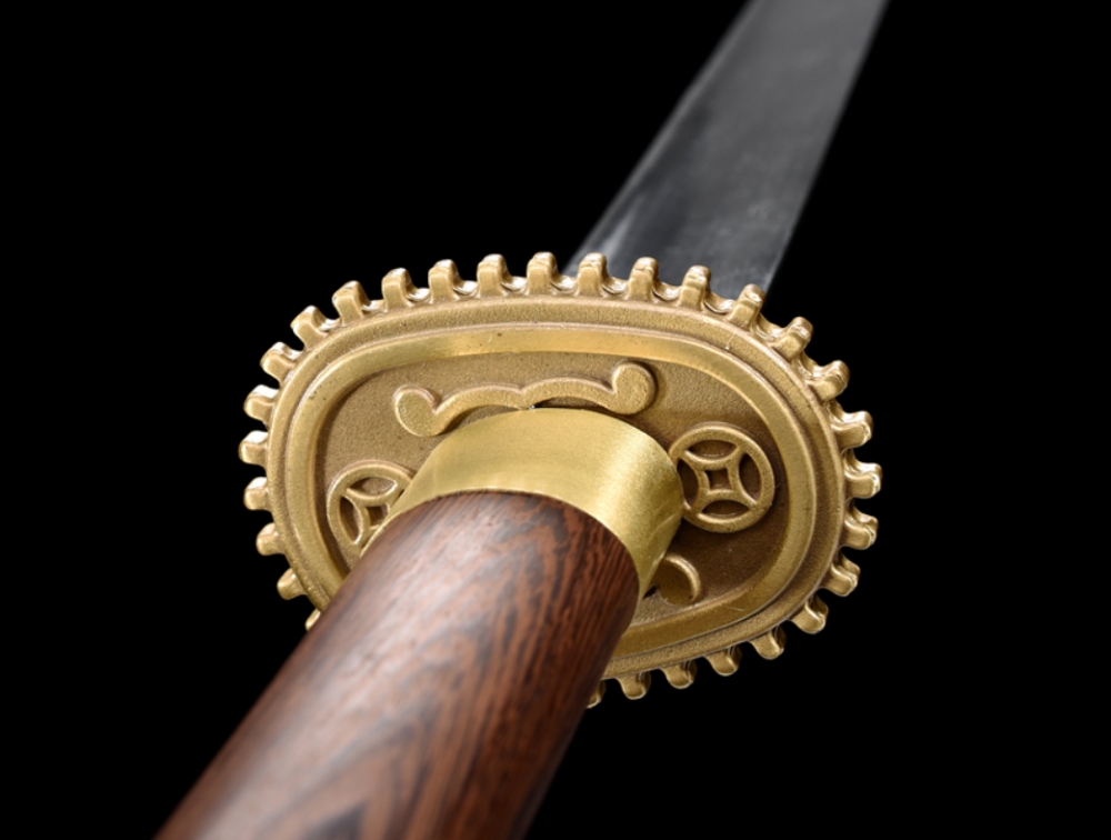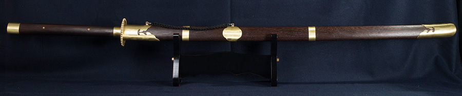A kétkezes kard pengéje rozsdamentes acél, amely két csappal van a markolathoz rögzítve. A szerelékek anyaga sárgaréz., a markolat és a hüvely rózsfából készül. A szablyát díszdobozzal szállítjuk.