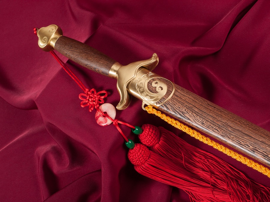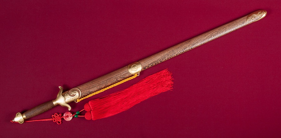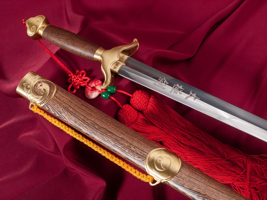 Rozsdamentes (440) flexibilis acélpengével készített kard, lakozott rózsafa markolattal és kardhüvellyel.
