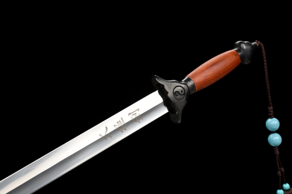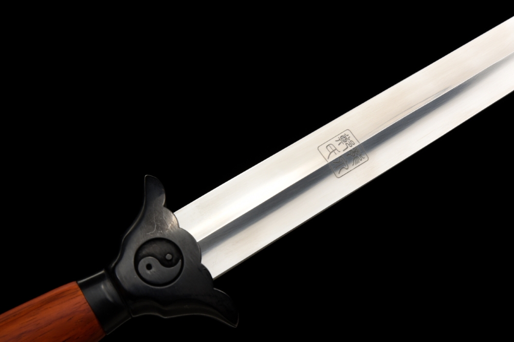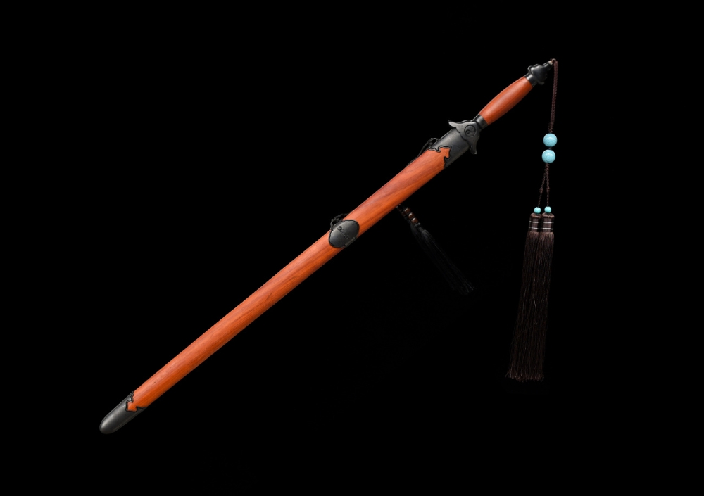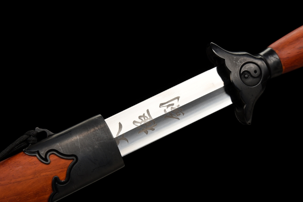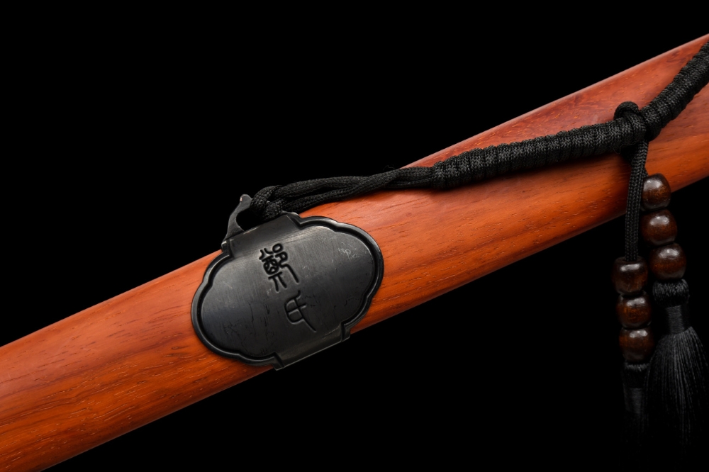 Rozsdamentes (440) flexibilis acélpengével készített kard, lakkozott rózsafa markolattal és kardhüvellyel.