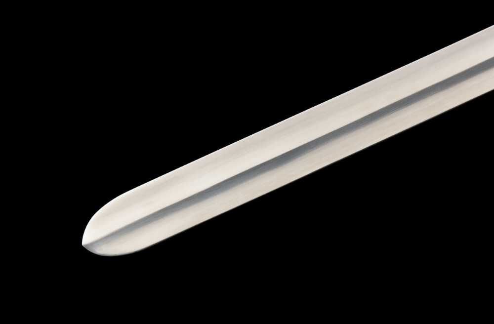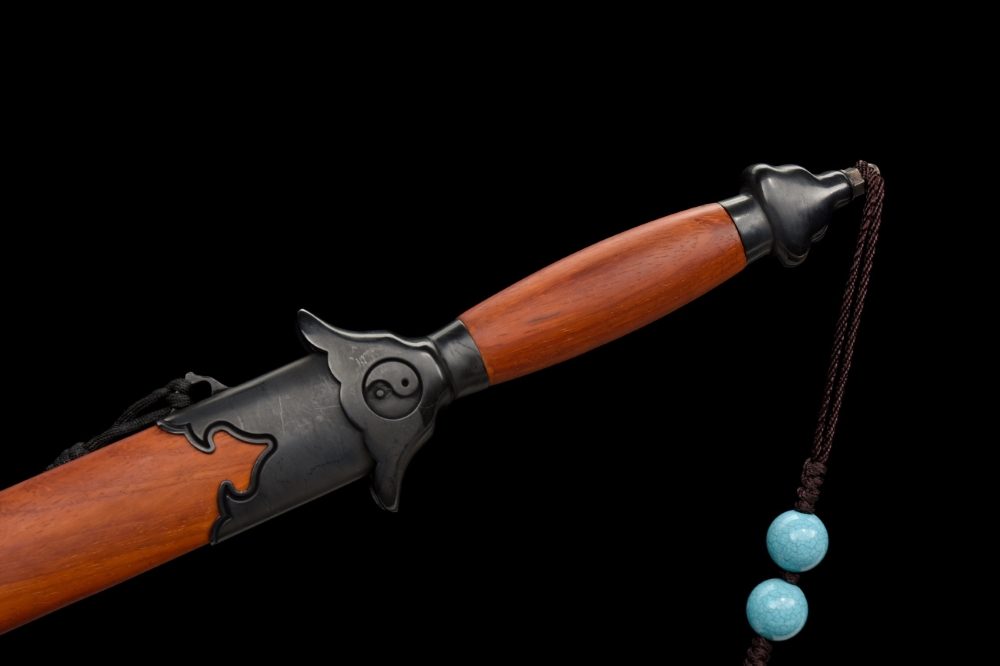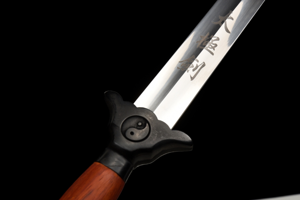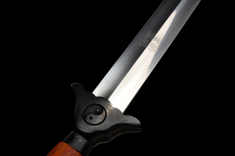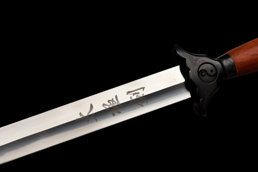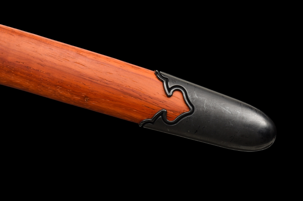 Rozsdamentes (440) flexibilis acélpengével készített kard, lakkozott rózsafa markolattal és kardhüvellyel.