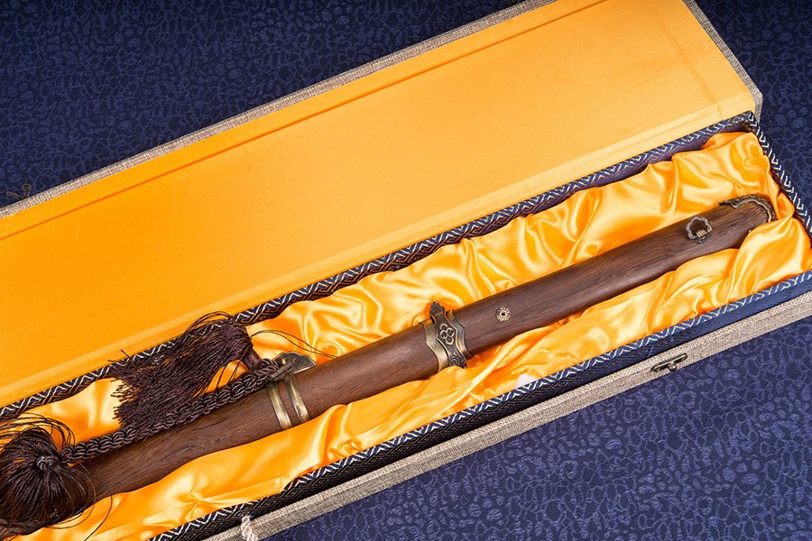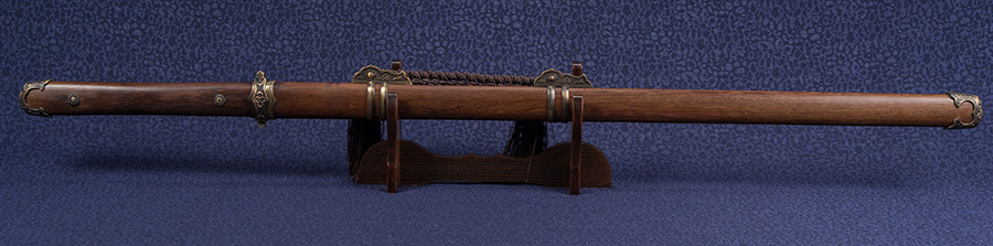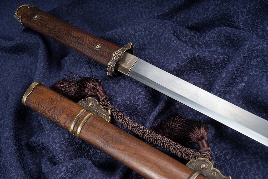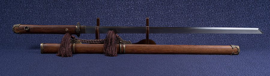 Tang-dinasztia korabeli stílusban kovácsolt kard. A korszakot a kínai történelem aranykorának tartják (VII-IX. század). Az egyélű, damaszkolt, élezett kardpenge rózsafa markolatban végződik. Az azonos fából készített kardhüvelyen és a markolaton bronz szerelékeket láthatunk. A kard Kína legjelentősebb kardkészítő régiójában, Longquanban készül.