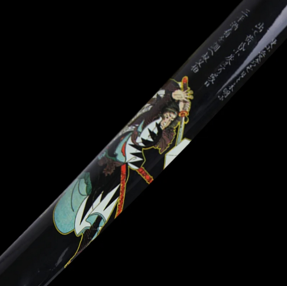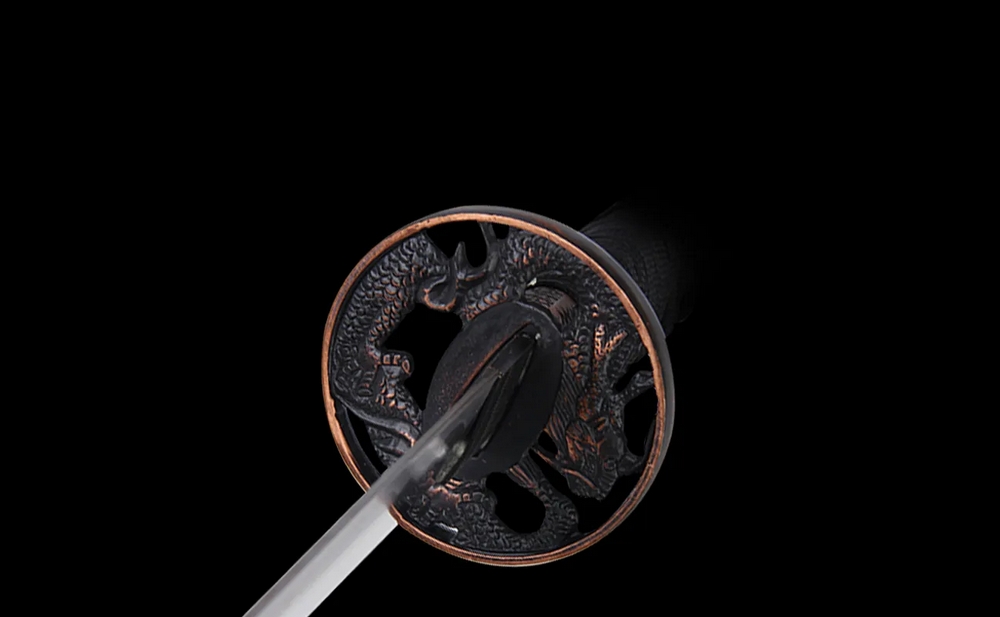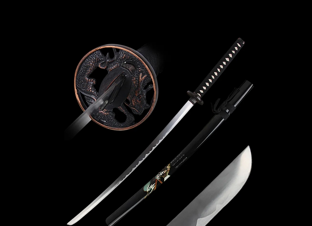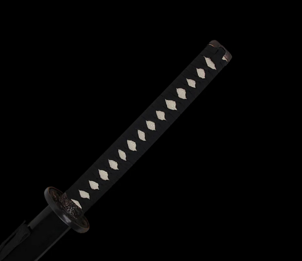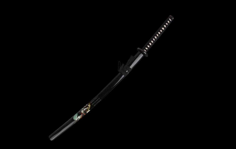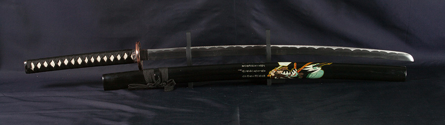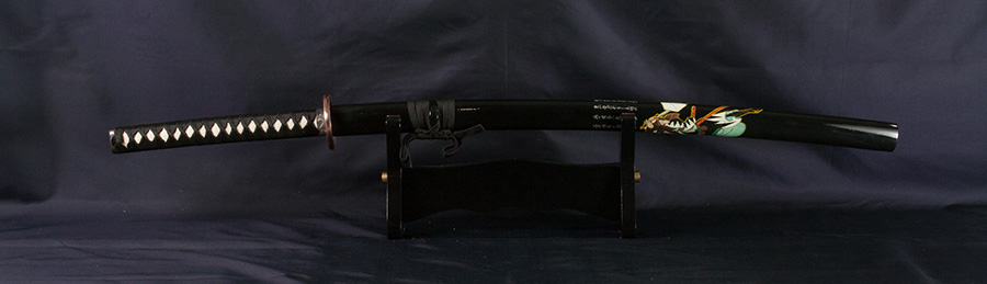 Acélpengével készített díszkard. A tsuba anyaga fémötvözet, a kardhüvely lakkozott keményfából készült.
