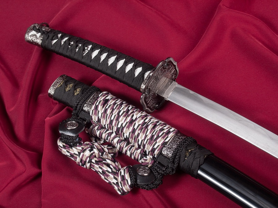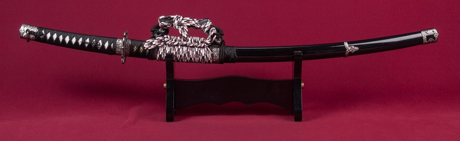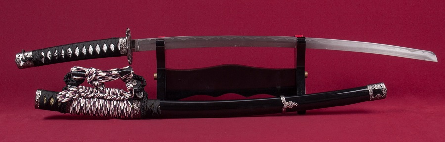 Díszkard szénacél pengével. A díszes tsuba anyaga fémötvözet, a kardhüvely (saya) anyaga fa.