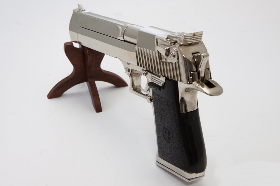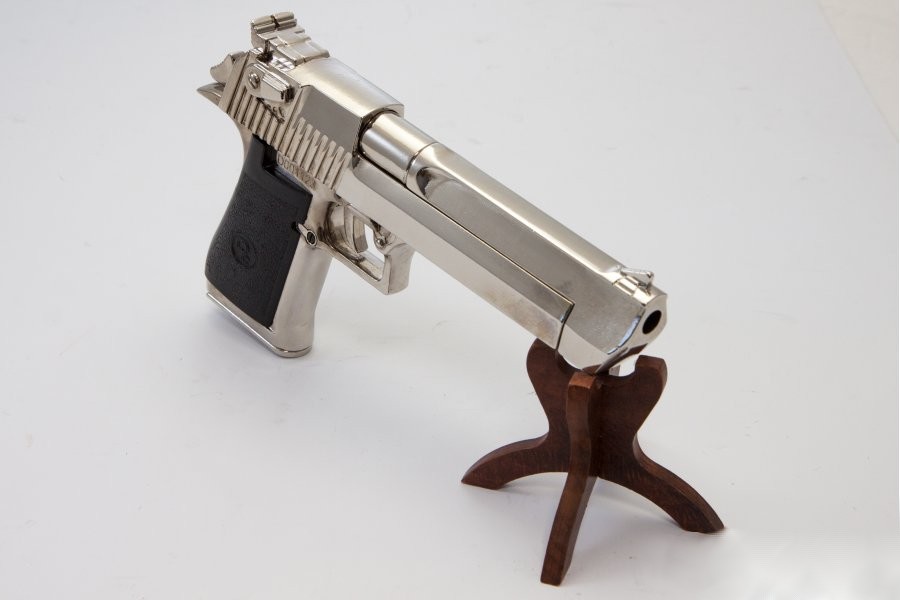 A félautomata pisztoly másolata nikkelezett fémötvözetből, működő mechanikával, kivehető tárral készül. A markolatborítás műanyag, a replika súlya 1590 gramm.