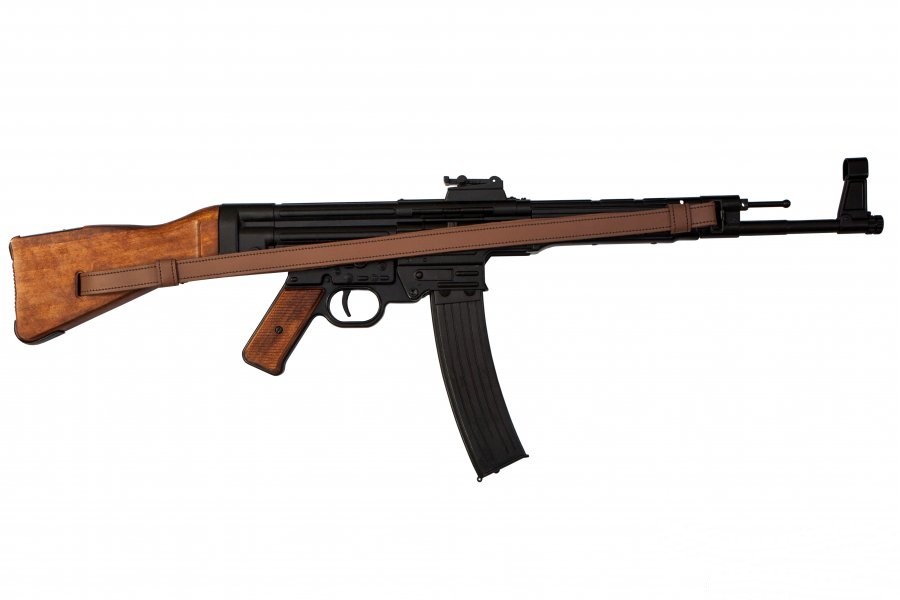 Díszfegyver vállszíjjal, működő mechanikával, a tár kivehető. Anyaga fa és fém, súlya 4824 gramm.