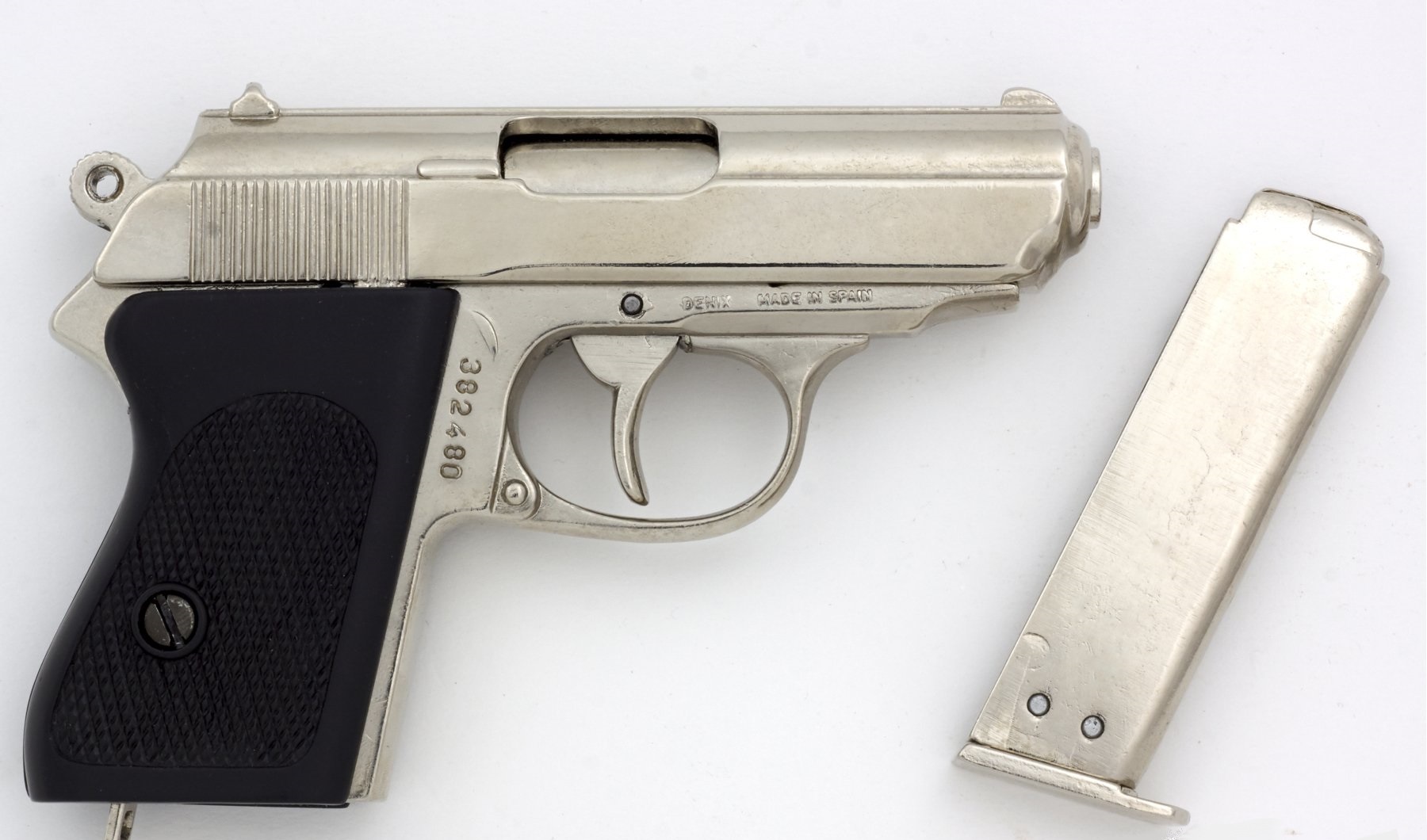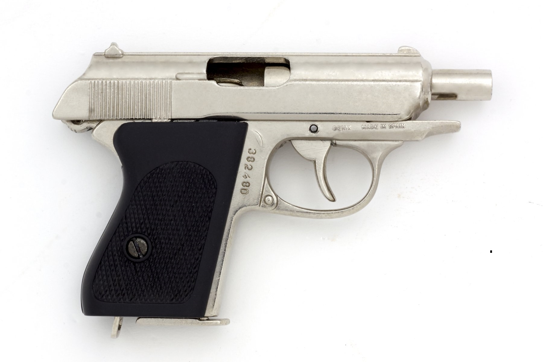 Nikkelezett díszfegyver, működő mechanikával, kivehető tárral. Anyaga fémötvözet, a plakett műanyagból készül. A díszfegyver súlya 590 gramm.