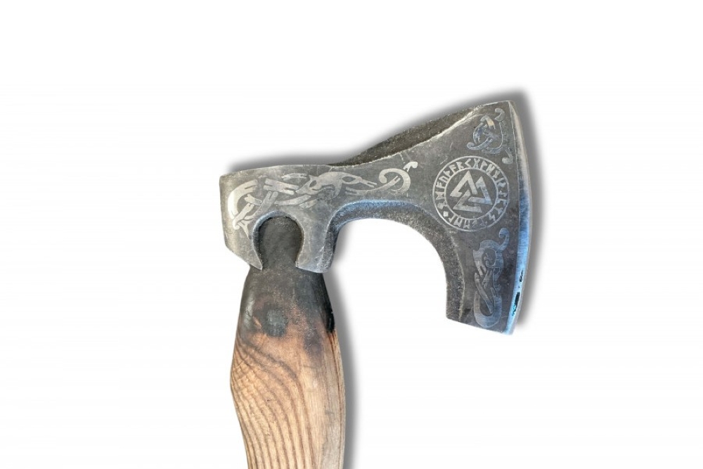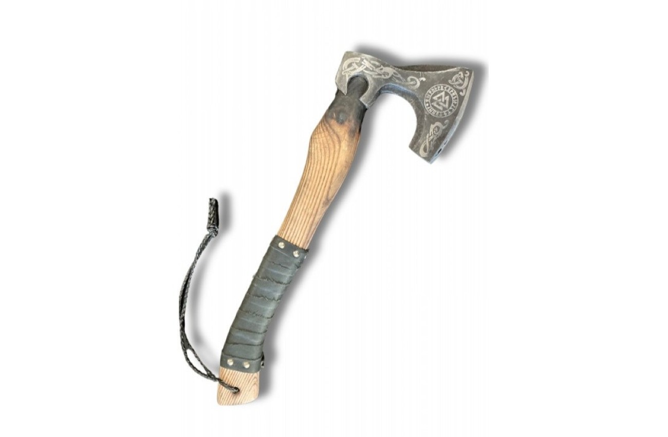 Az edzett acélpengével készített viking fejsze markolata bőrrel kötözött fa.