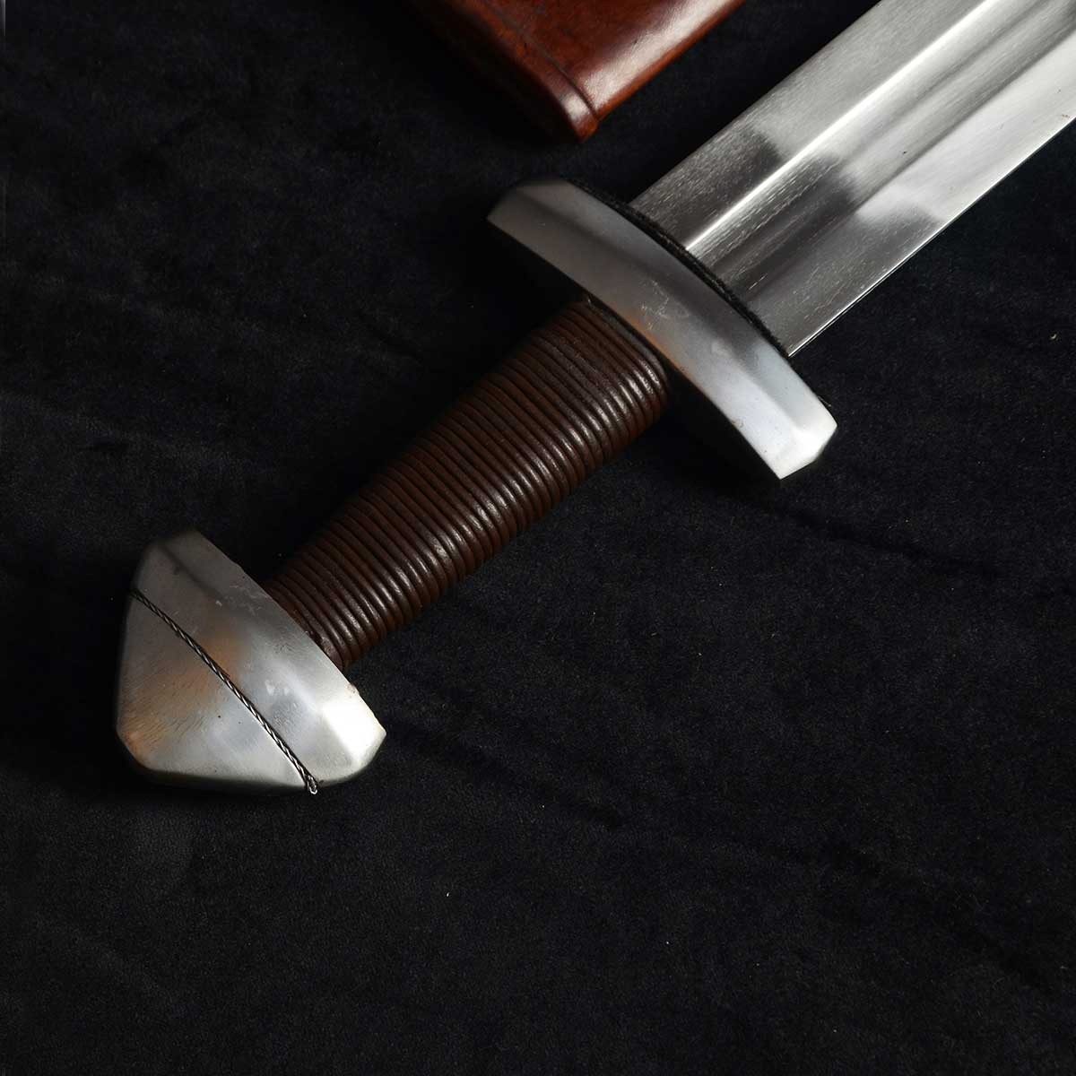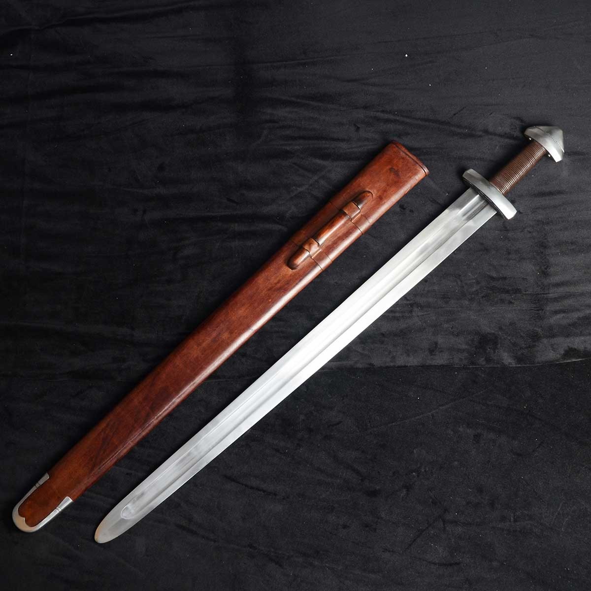 Az edzett, EN45-ös szénacélból kovácsolt kard széles vércsatornával könnyített, hüvelye és markolata bőrborítású fa.