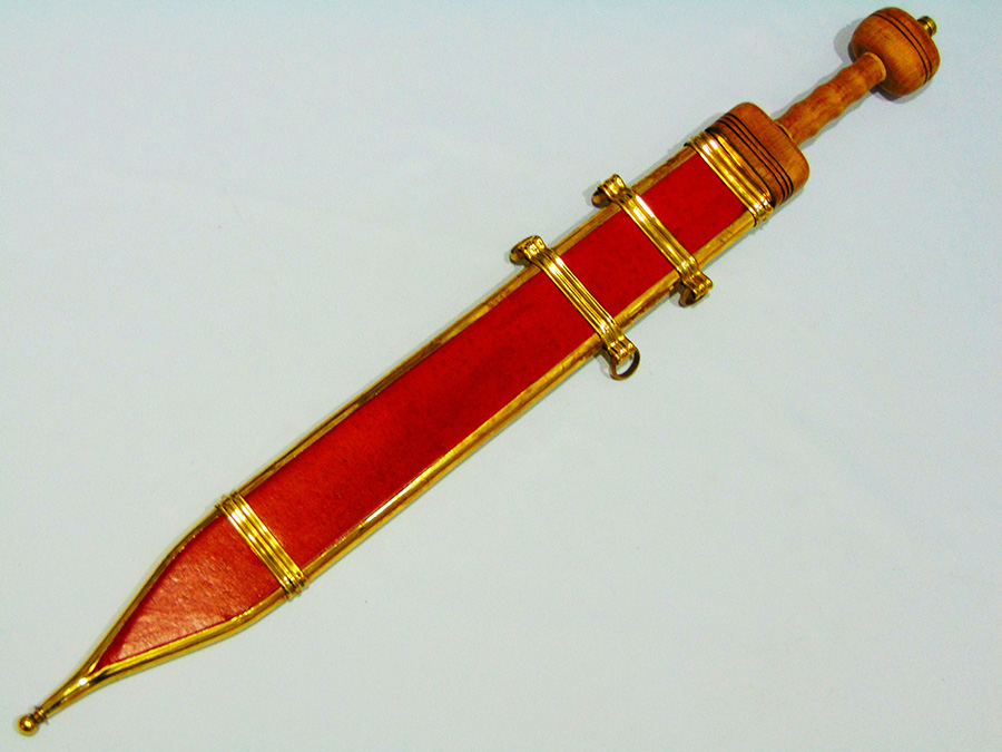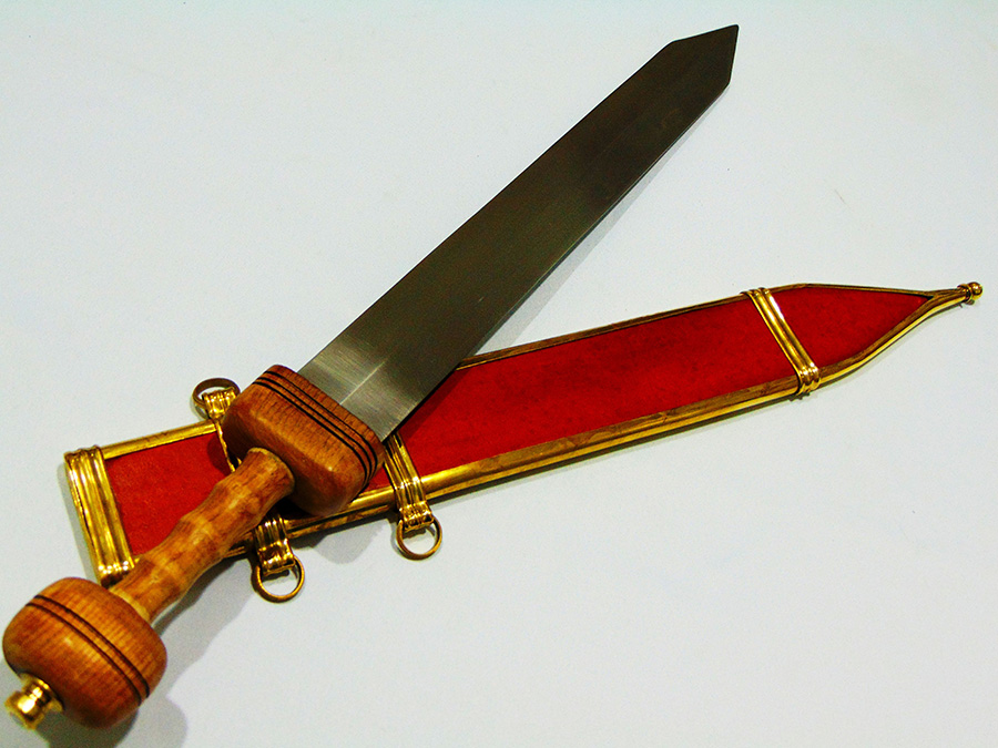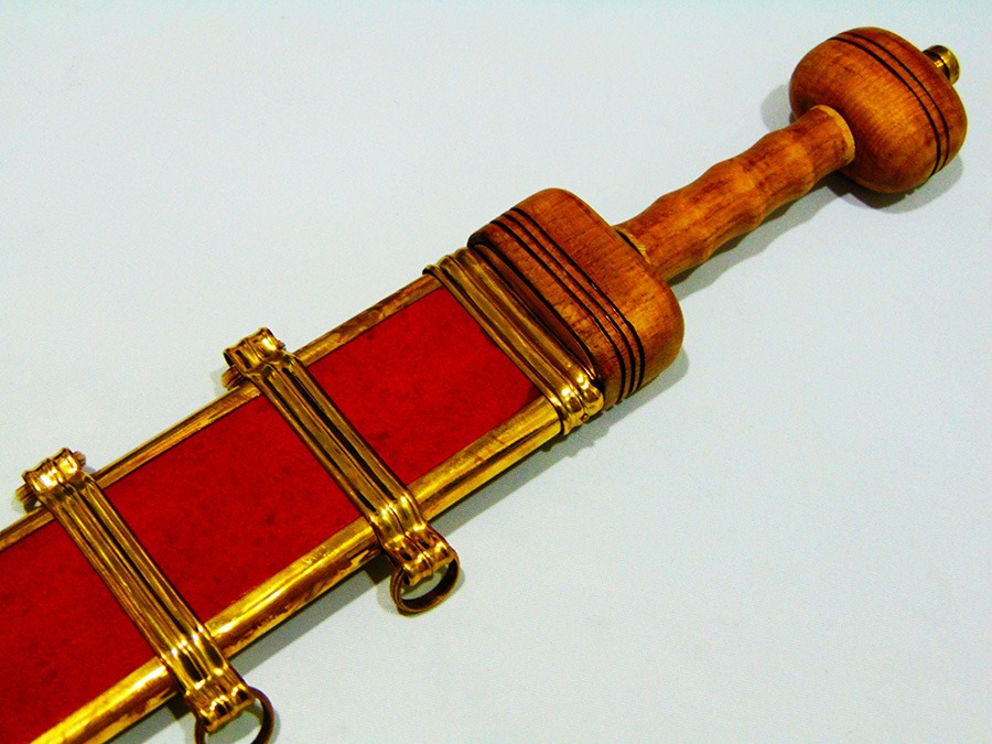 EN45 típusú szénacél pengével kszített római kard, bőrborítású fahüvellyel és réz szerelékkel. Hagyományőrzésre is alkalmas.