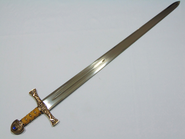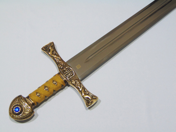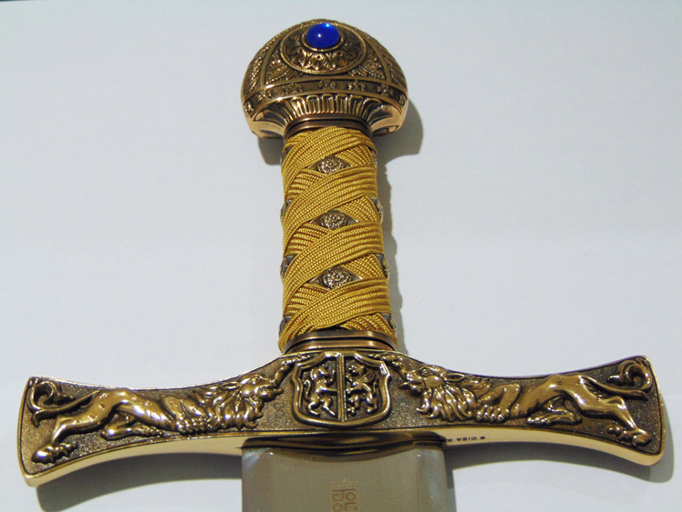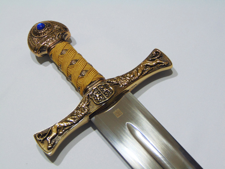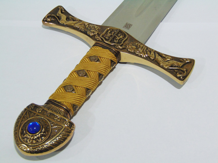 Díszkard. A penge toledói acél, a markolat szövetborítású fémötvözet. A keresztvas is gazdagon díszített fémötvözet réz borítással. A keresztvason két oroszlán áll egymással szemben.