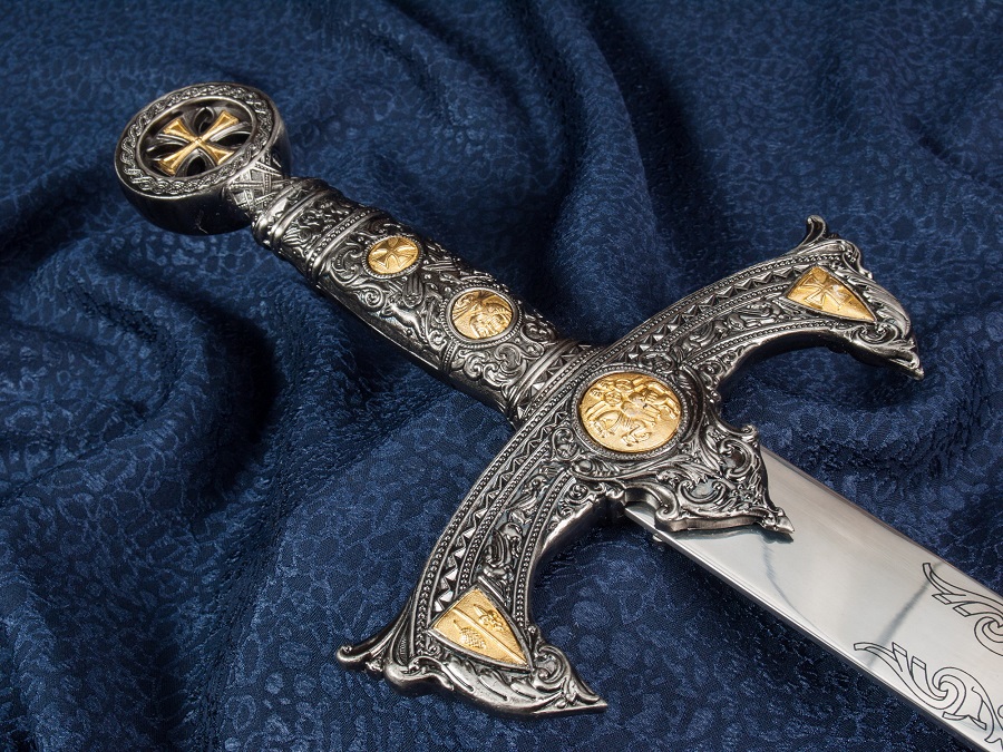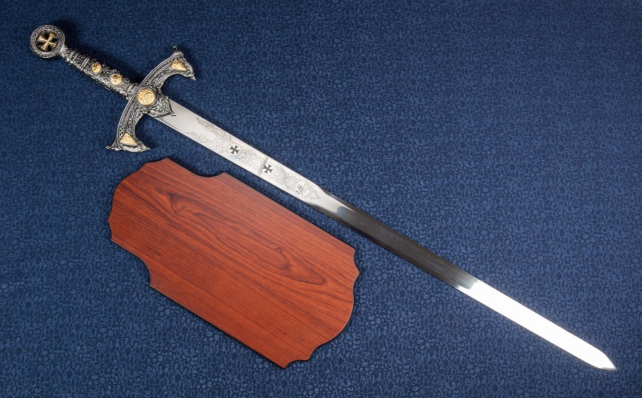 Rozsdamentes acélból készült díszkard, gazdagon díszített templomos rendi szimbólumokkkal.