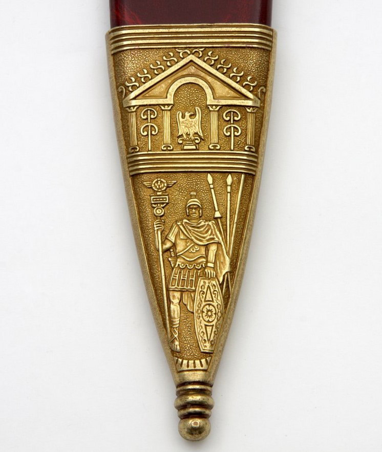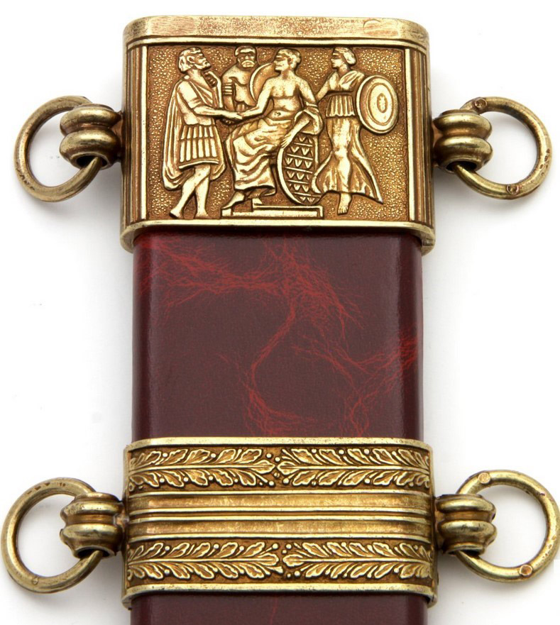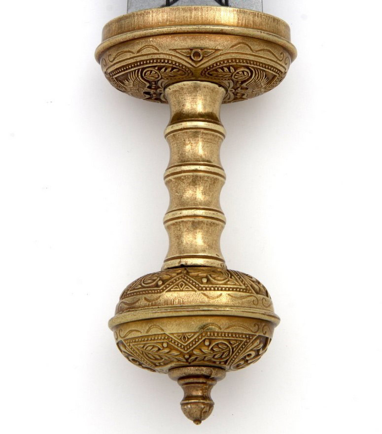Díszkard. A penge és a díszes markolat anyaga fémötvözet. A hüvely bőr borítású, gazdagon díszített.