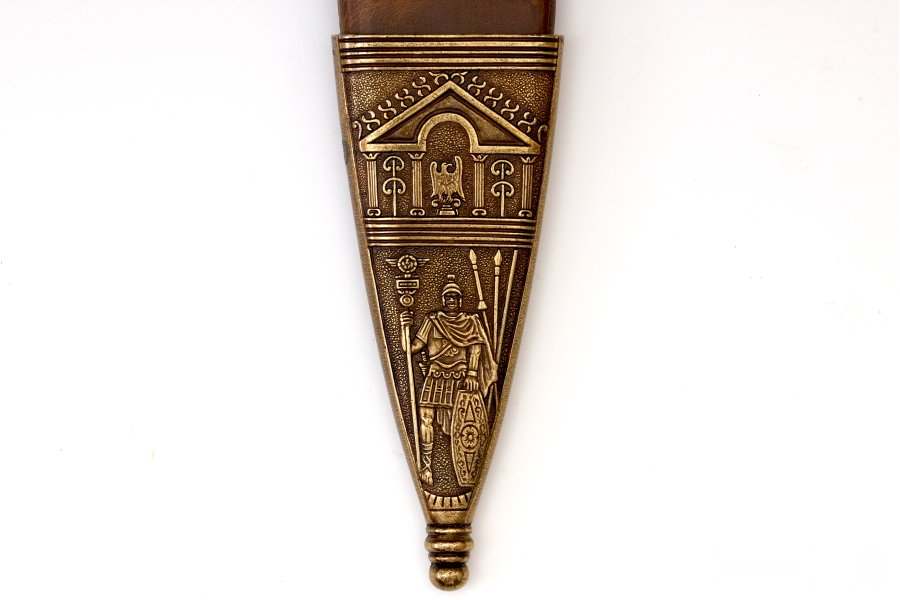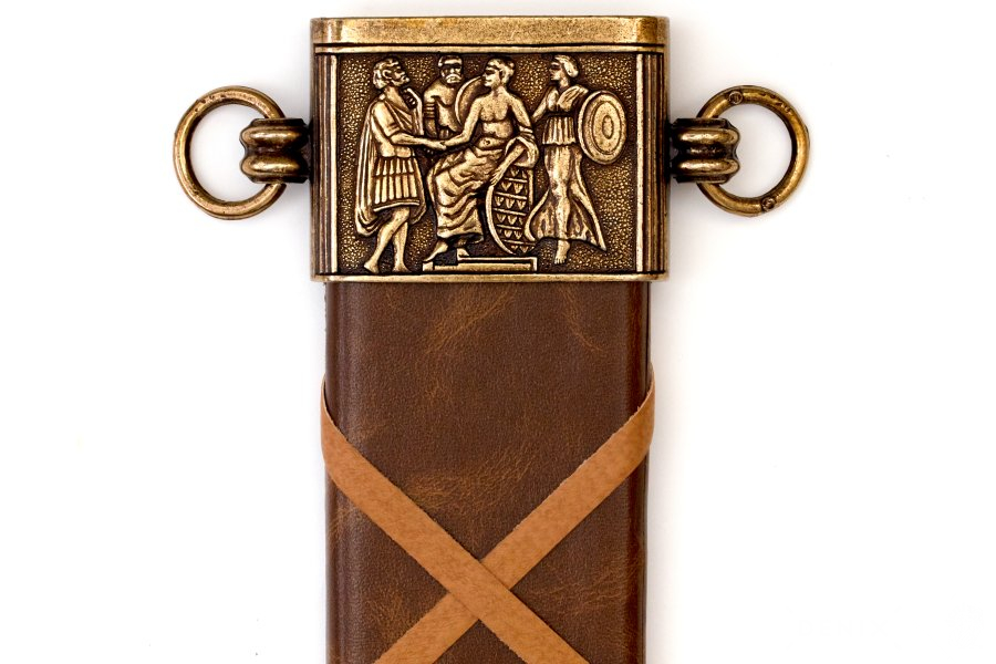 Díszkard. A penge antikolt fémötvözet, a markolatgomb és a markolatvédő anyaga fa. A hüvely bőr borítású, gazdagon díszített.