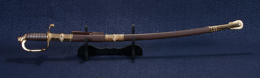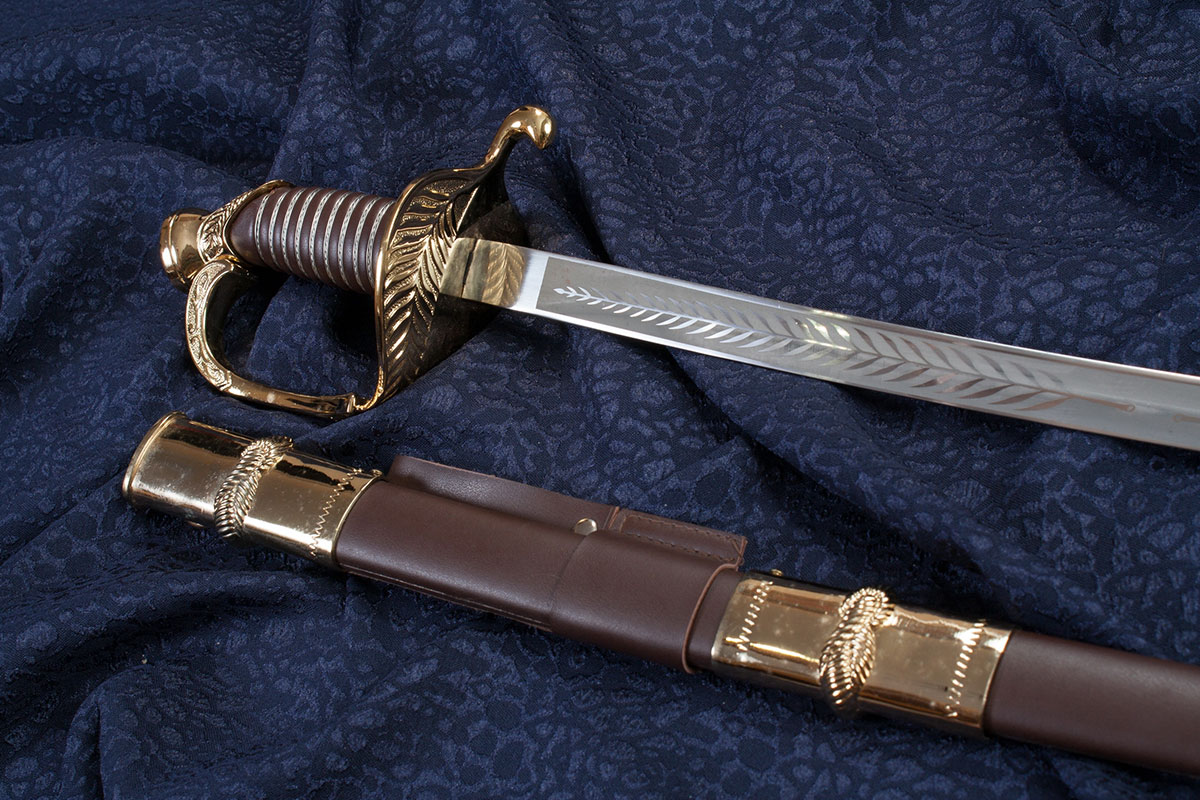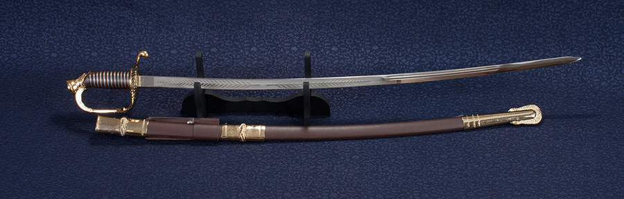 Rozsdamentes acél pengével készített öltözék kard, bőr borítású fém hüvellyel.