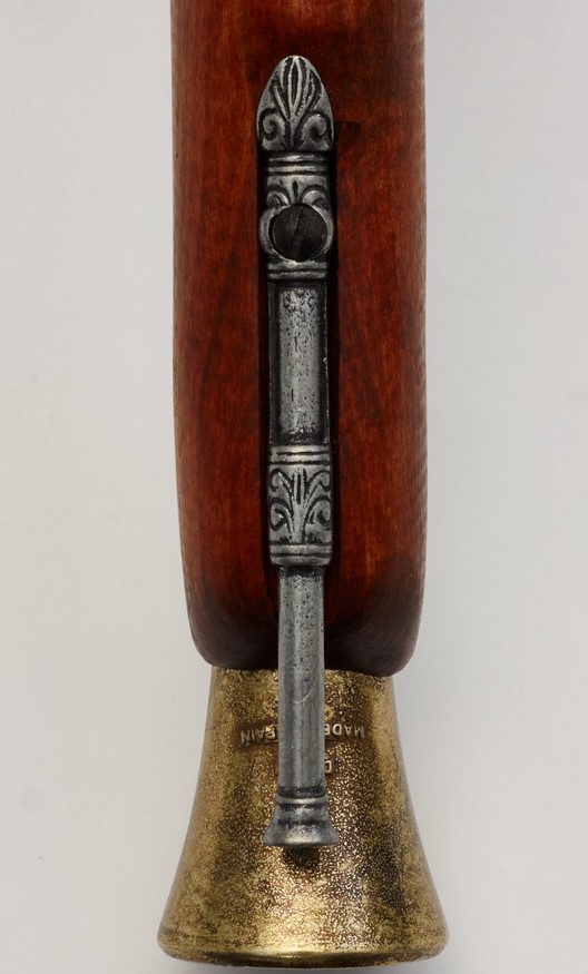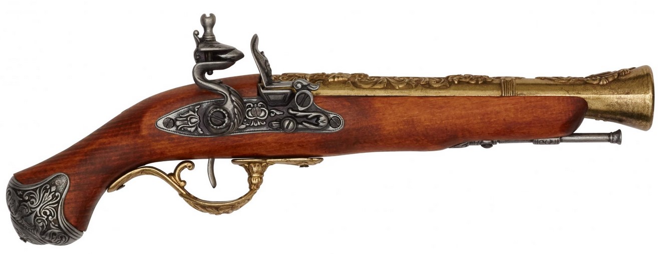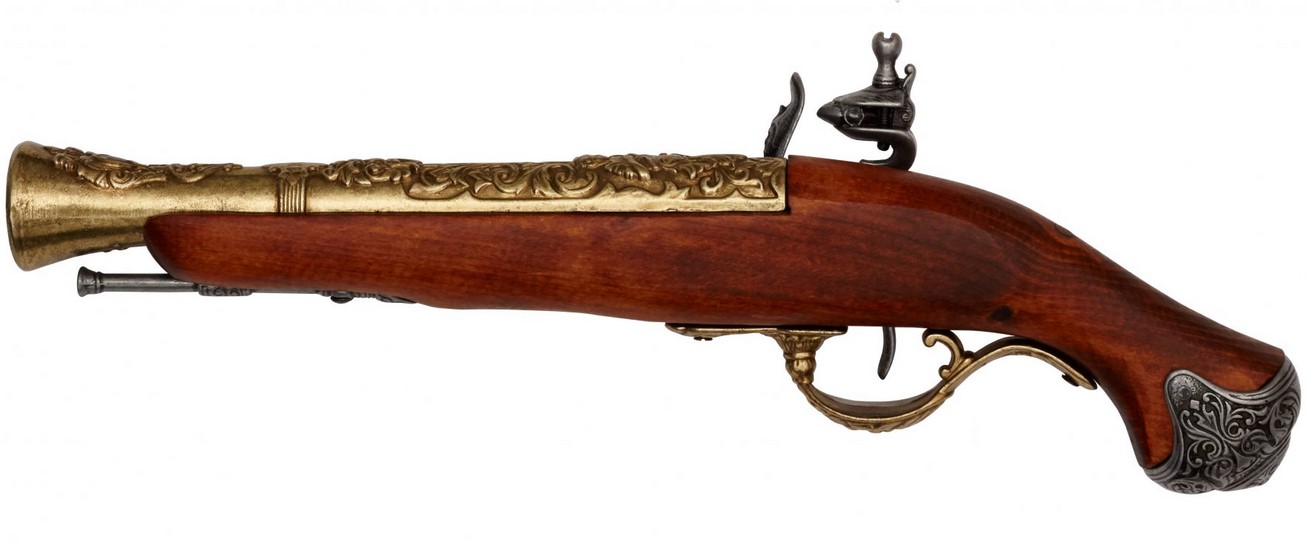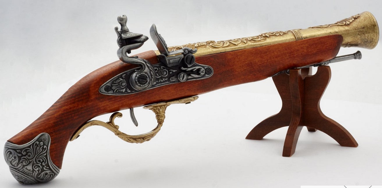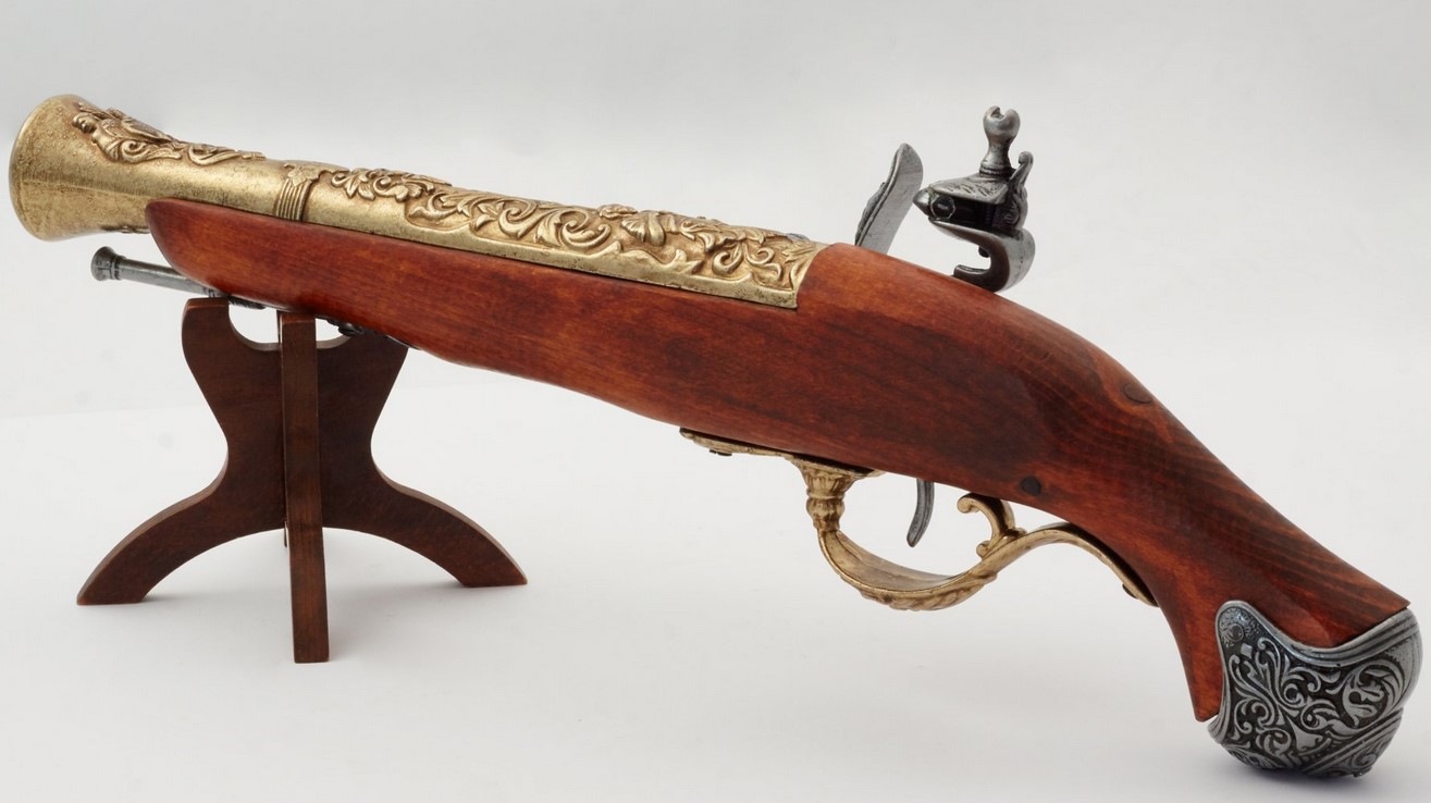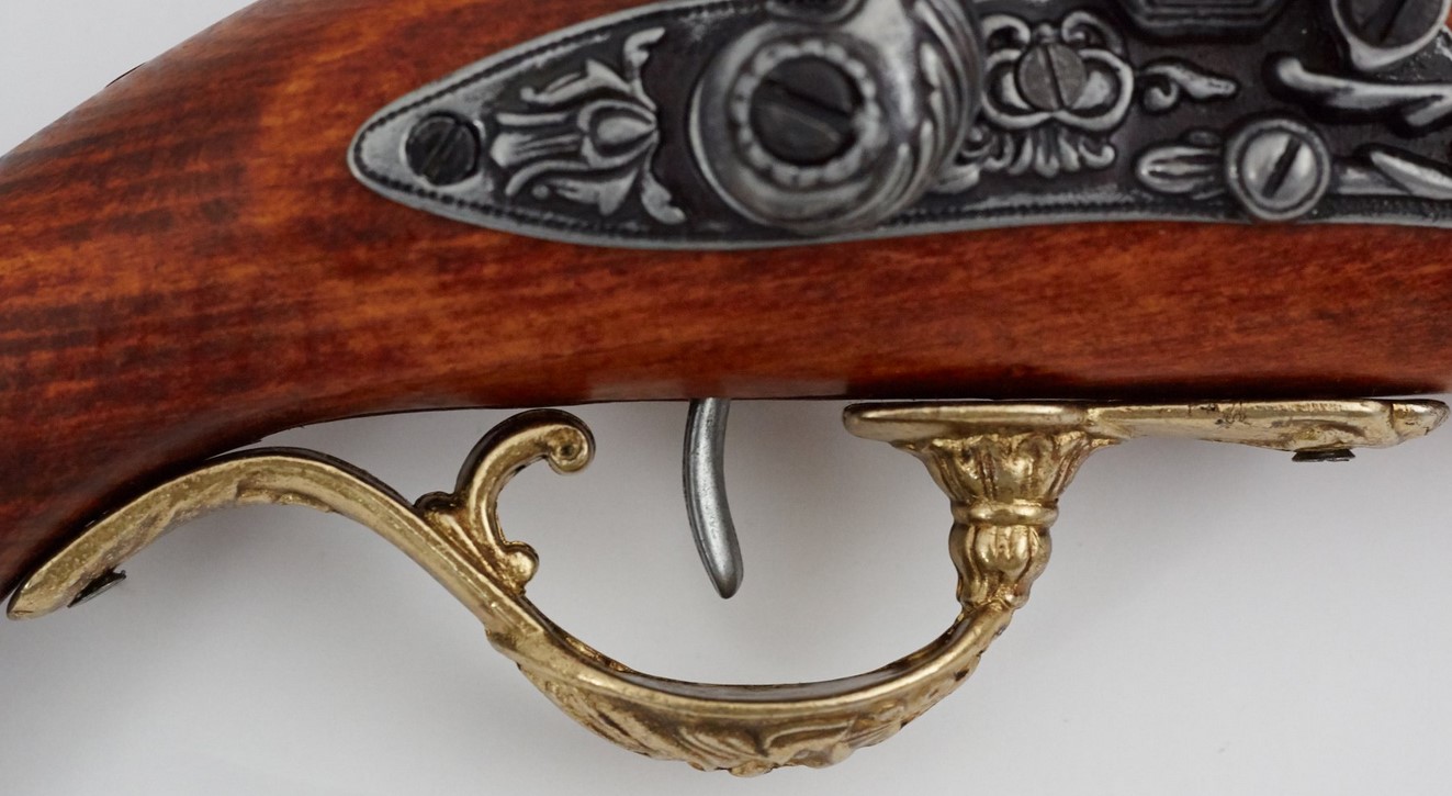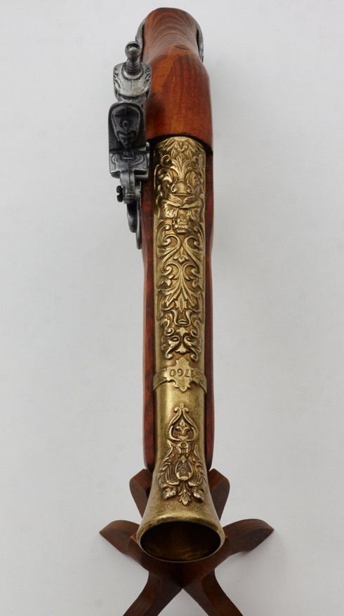 Díszpisztoly kovás lakatszerkezettel. A fából és fémötvözetből készült másolat súlya 550 gramm.