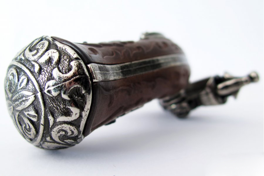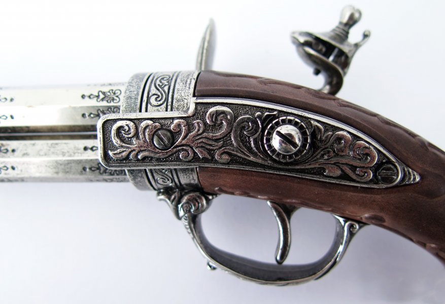 Díszes, elöltöltős pisztoly másolata forgatható pisztolycsővel. A másolat anyaga fémötvözet és fa hatású műanyag. A díszpisztoly súlya 895 gramm.