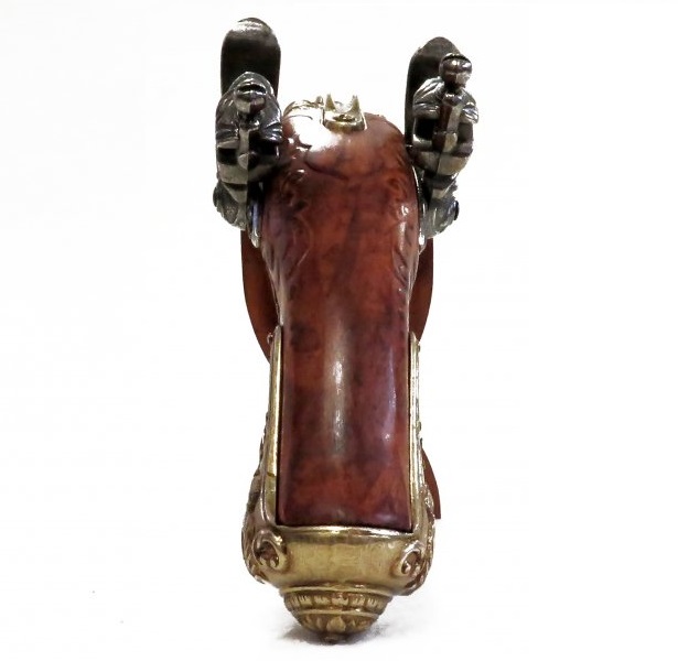 Működő mechanikával rendelkező, kovás lakatszerkezetű, gazdagon díszített pisztolymásolat.