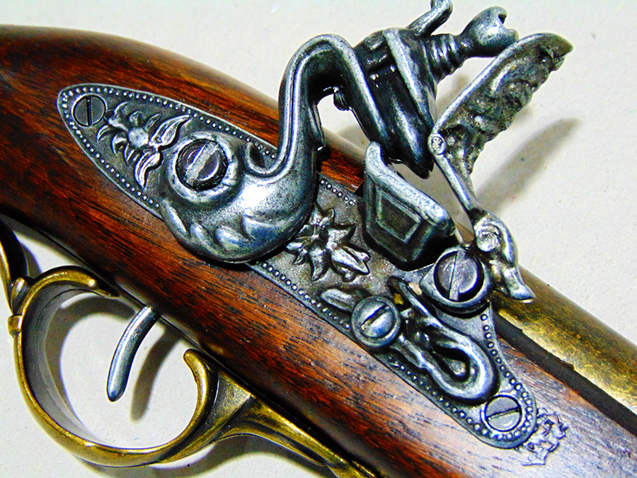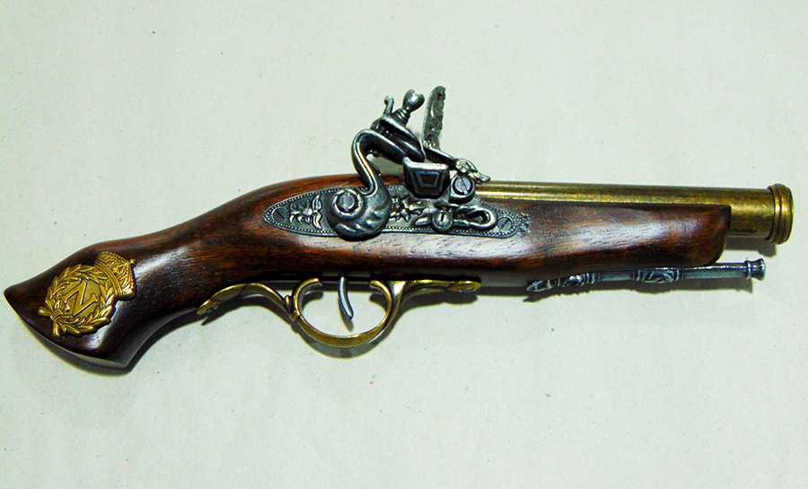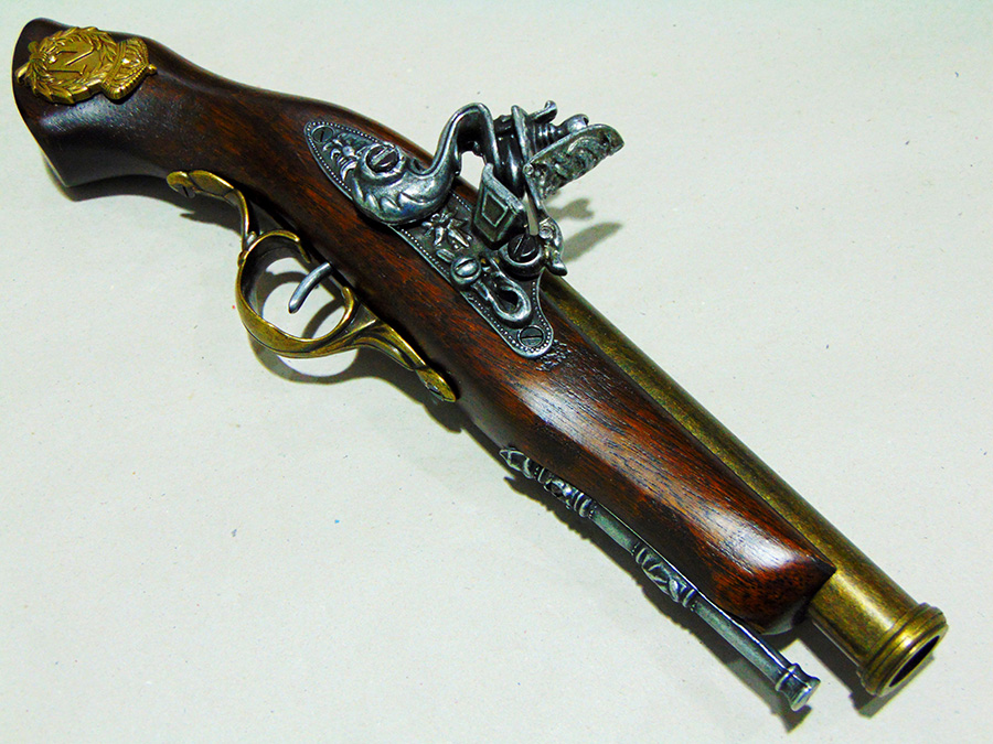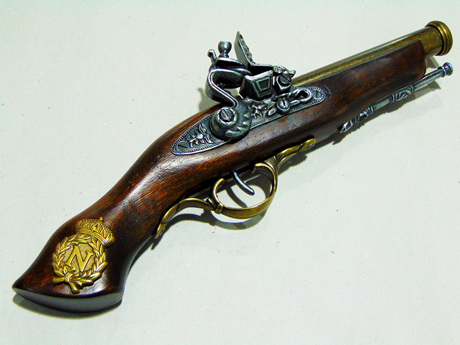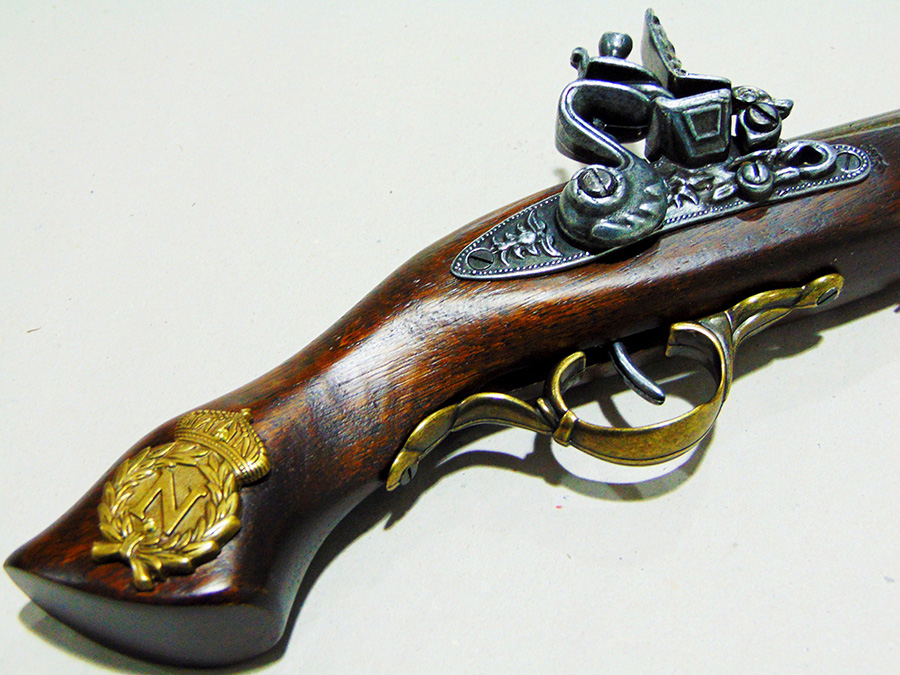Működő mechanikájú díszpisztoly. Anyaga fa és fémötvözet. A pisztolyhoz vásárolható Napóleon-emblémás fegyvertartó is, barna színben (kódszáma: 52/1NAP.01, ára: 8.000 Ft).