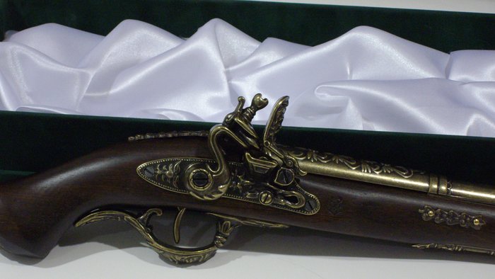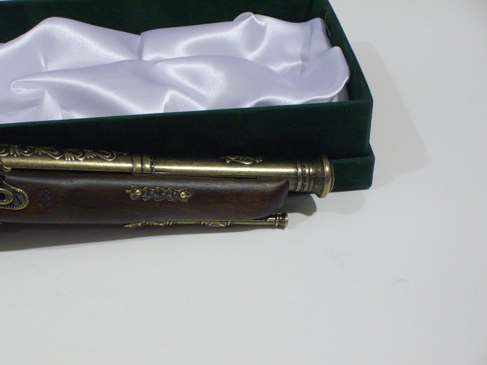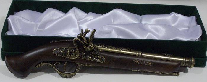 A díszpisztoly anyaga fa és fémötvözet. Mechanikusan működő és kovás lakatszerkezetű.