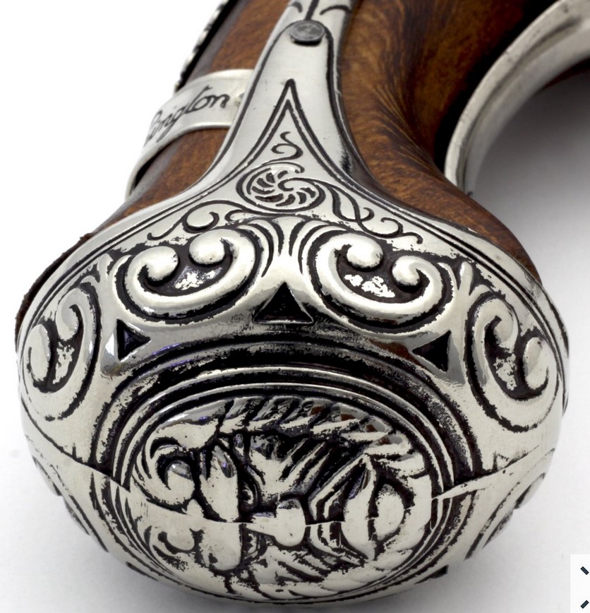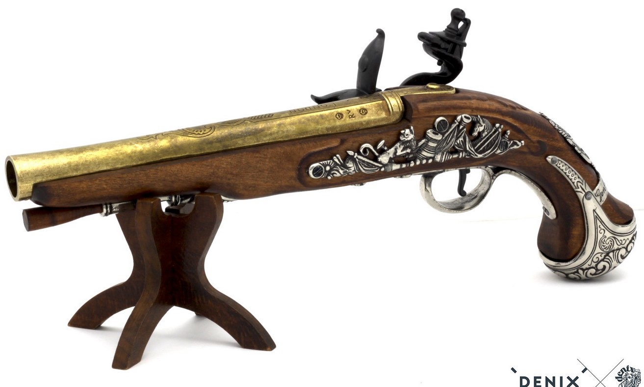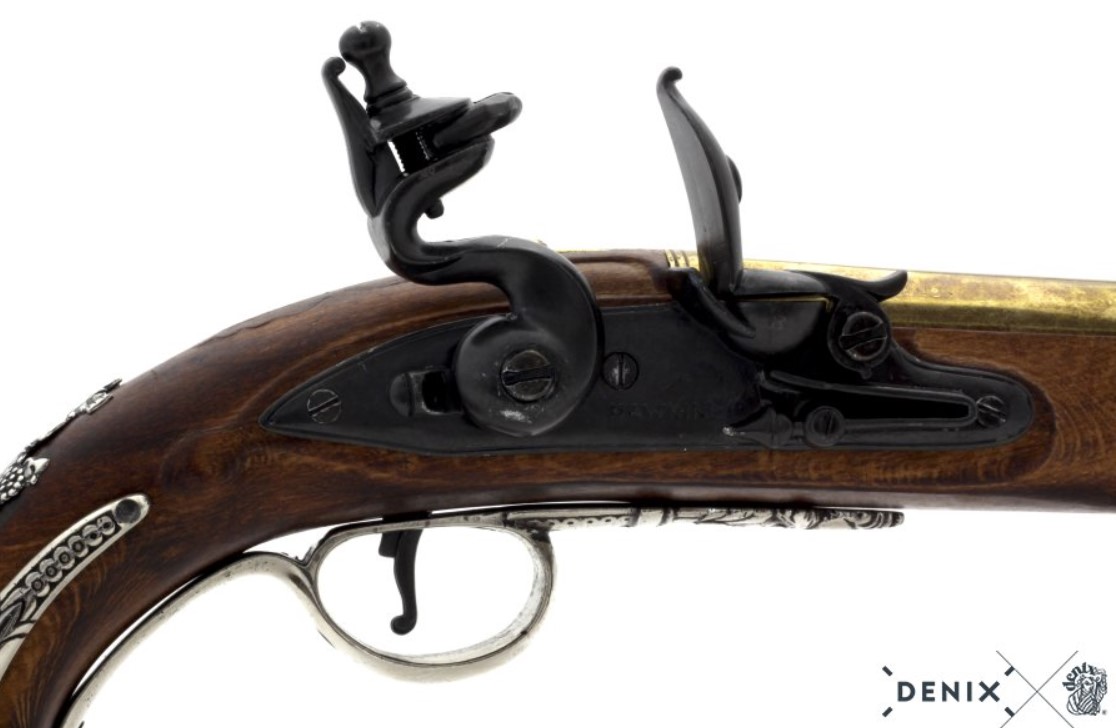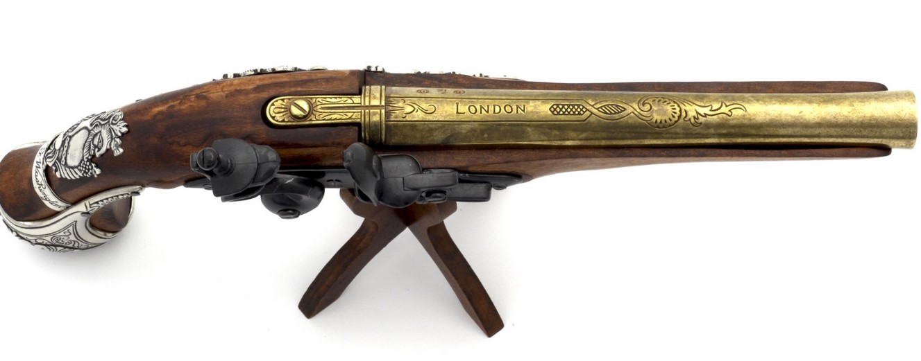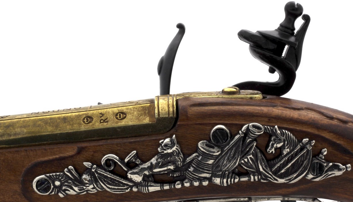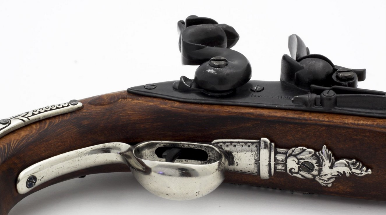 Kovás lakatszerkezetű, gazdagon díszített pisztolymásolat.