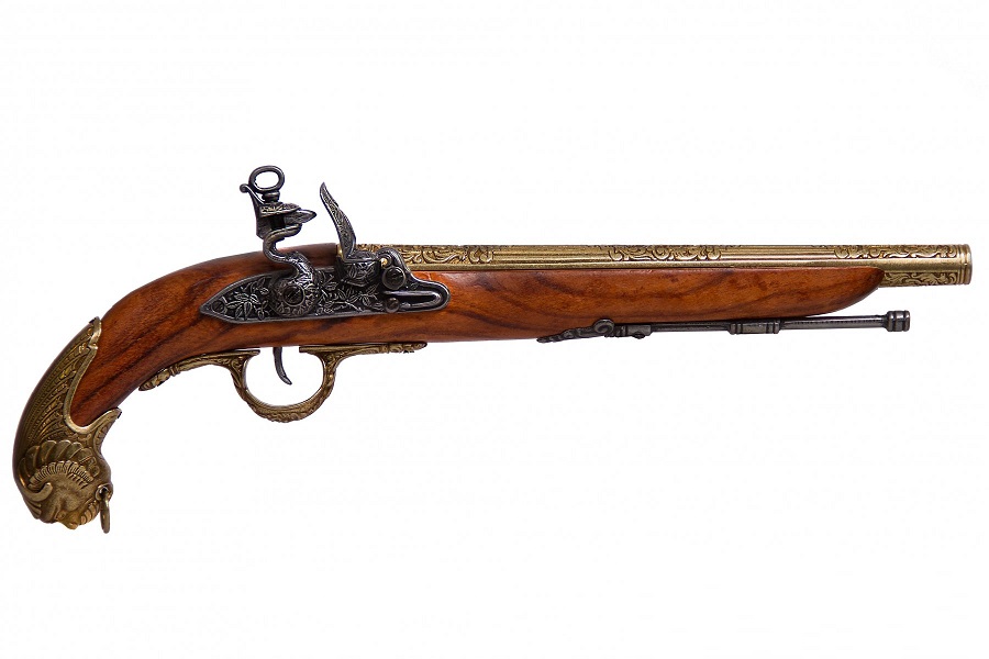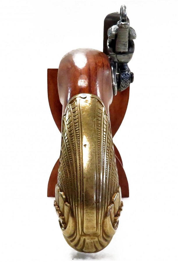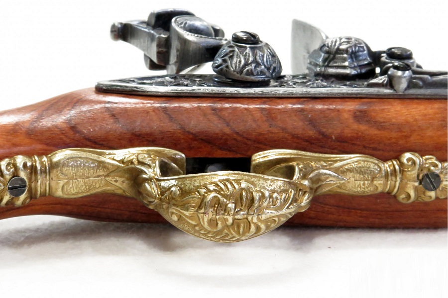 Fegyvermásolat gazdagon díszített markolattal és pisztolycsővel. Anyaga fa és fémötvözet, súlya 830 gramm.