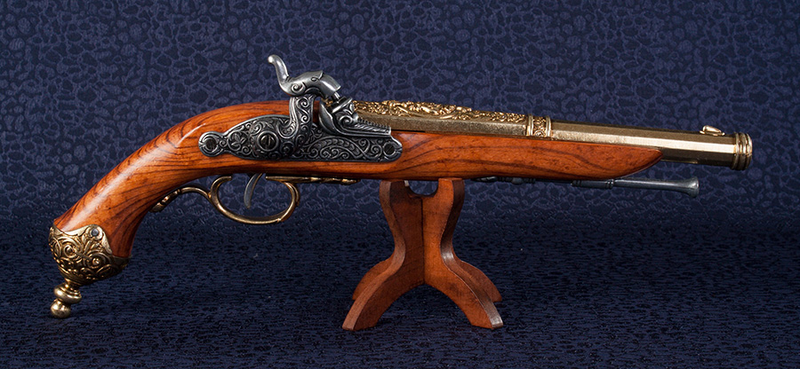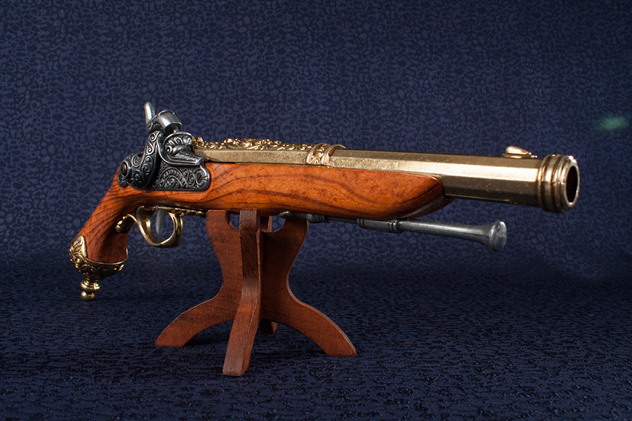 Működő mechanikával elkészített, elöltöltős fegyver másolata fából és fémötvözetből.