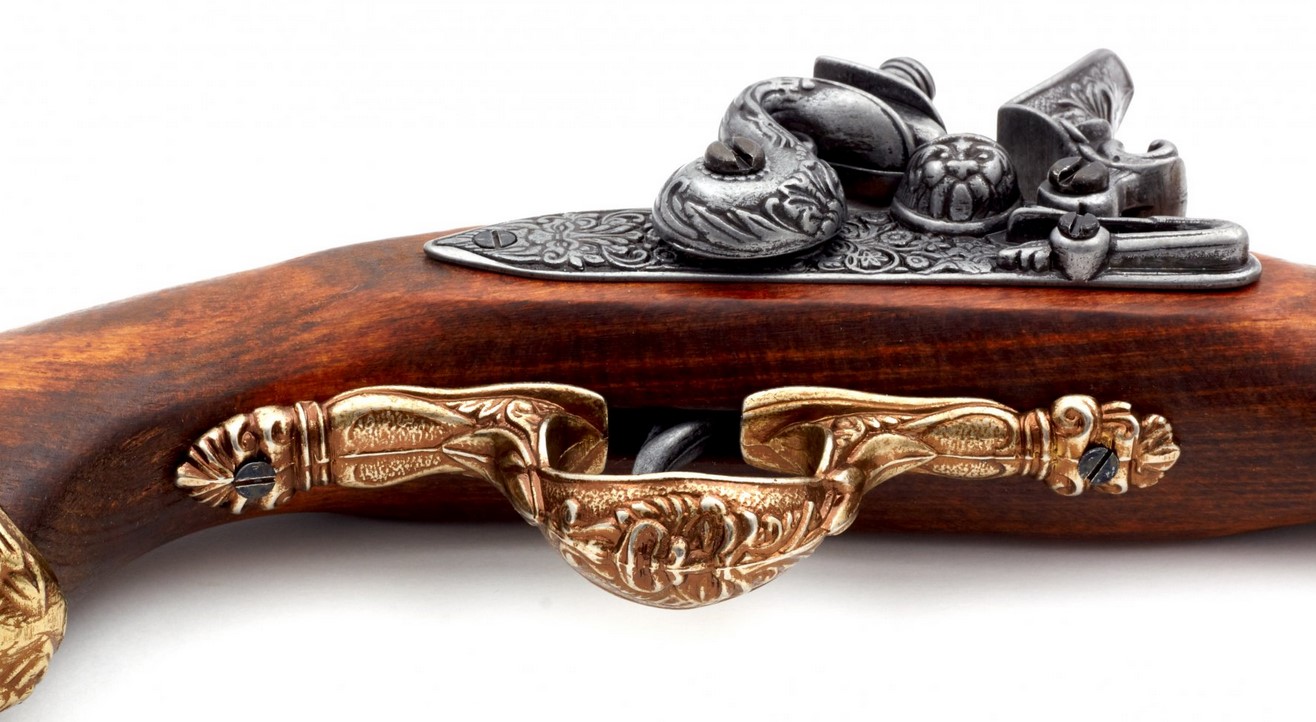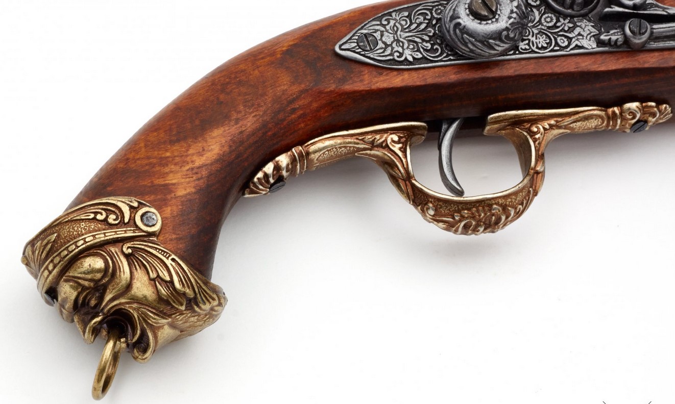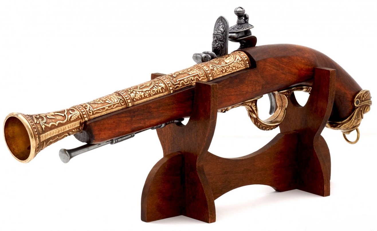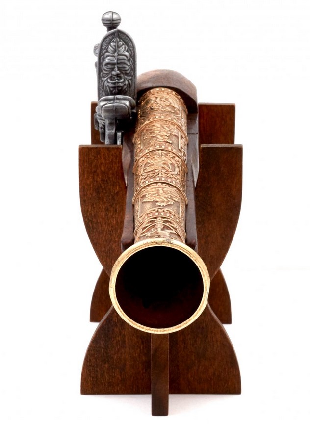 Kovás díszpisztoly működő mechanikával. Anyaga: fa és fémötvözet. A gazdagon díszített fegyvermásolat súlya 690 gramm.