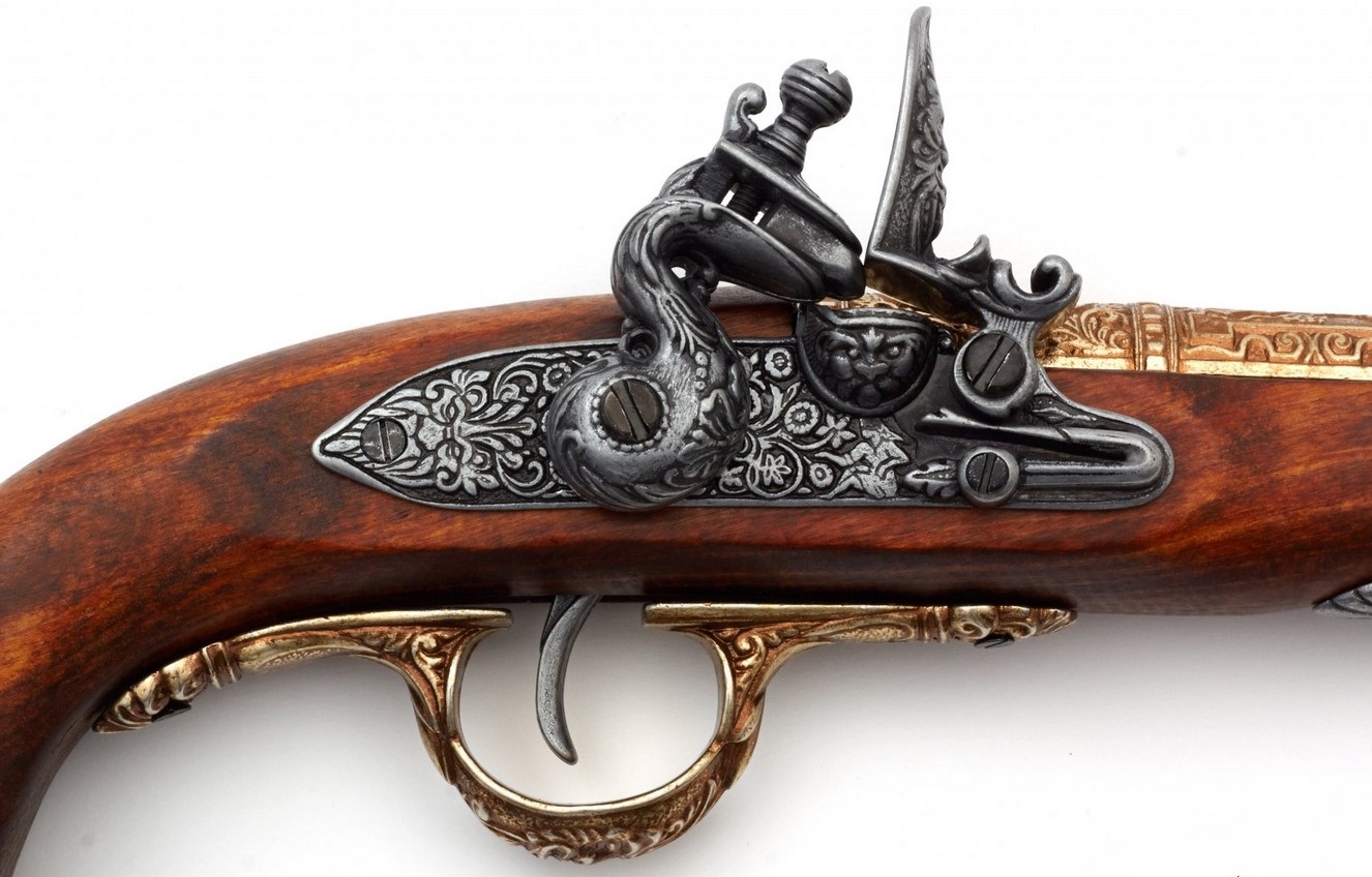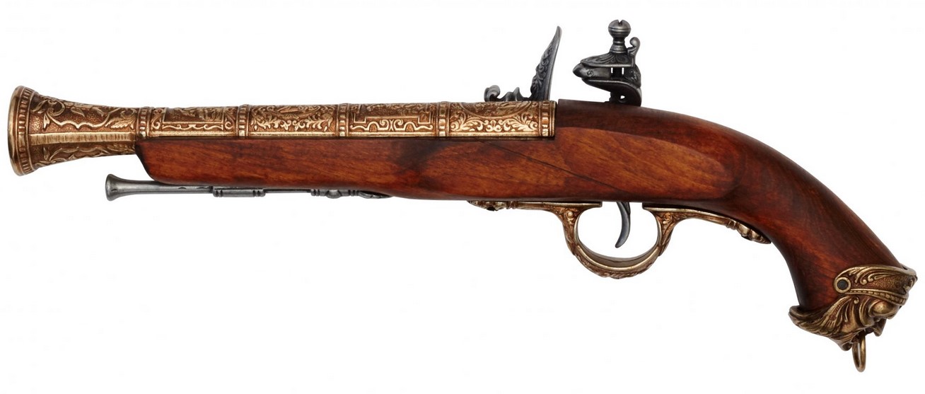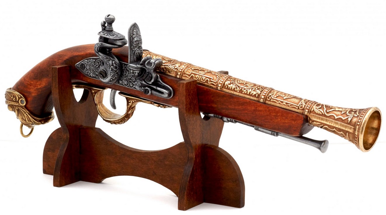 Kovás díszpisztoly működő mechanikával. Anyaga: fa és fémötvözet. A gazdagon díszített fegyvermásolat súlya 690 gramm.