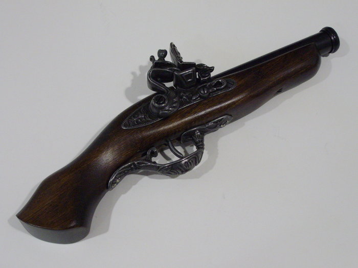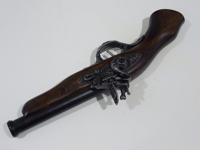 Kovás lakatszerkezetű díszpisztoly működő mechanikával. Ún. disznóláb pisztoly (a markolat formája miatt).