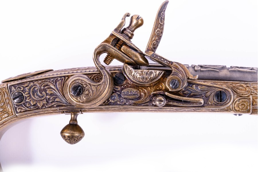 A kezei közül kikerülő példányokat az aprólékos díszítettség mellett a mesterségbeli találékonyság is jellemezte. Munkáit az arisztokrácia felső rétegei vásárolták. Ez a kovás lakatszerkezetű pisztoly valószínűleg Montgomerie gróf tulajdonába került. Az eredeti pisztoly pár a Royal Armouries Museum-ban (Leeds) megtekinthető.
