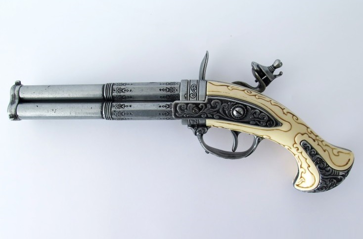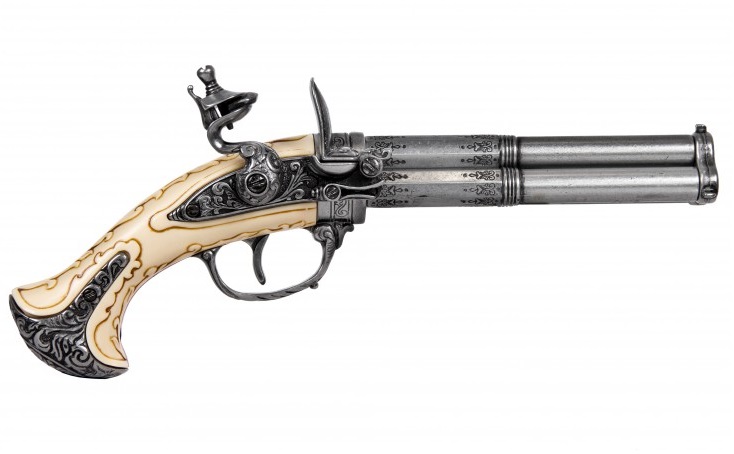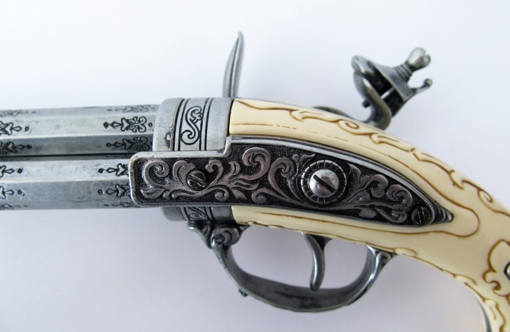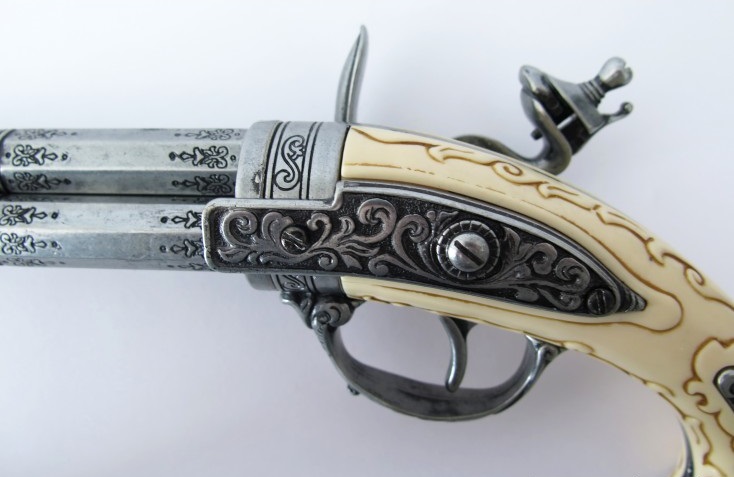 Díszes, elöltöltős pisztoly másolata forgatható pisztolycsővel. Az eredeti fegyver markolatát faragott elefántcsonttal díszítették. A másolat anyaga fémötvözet és elefántcsont utánzat.