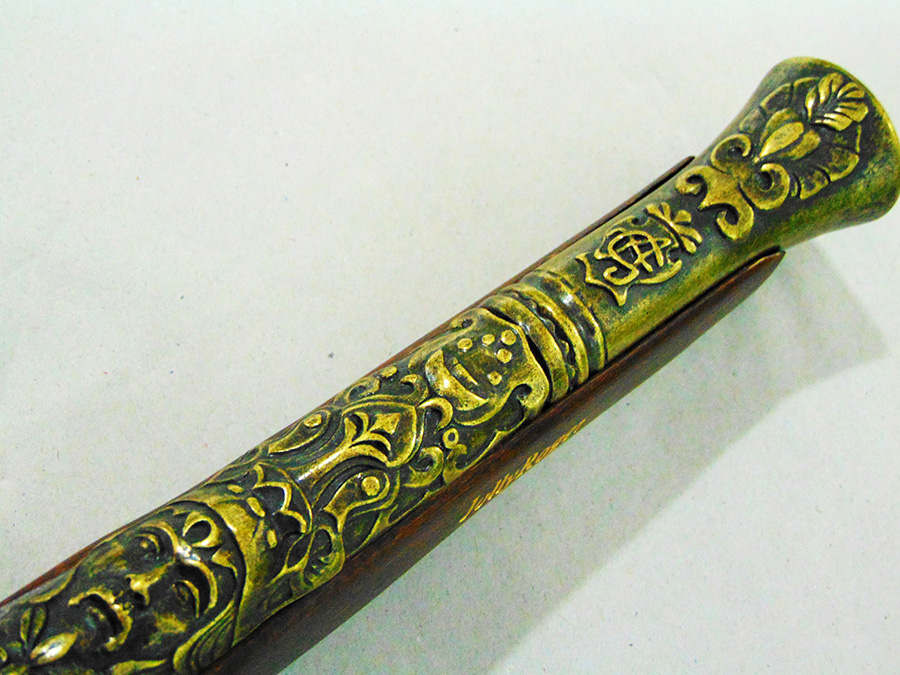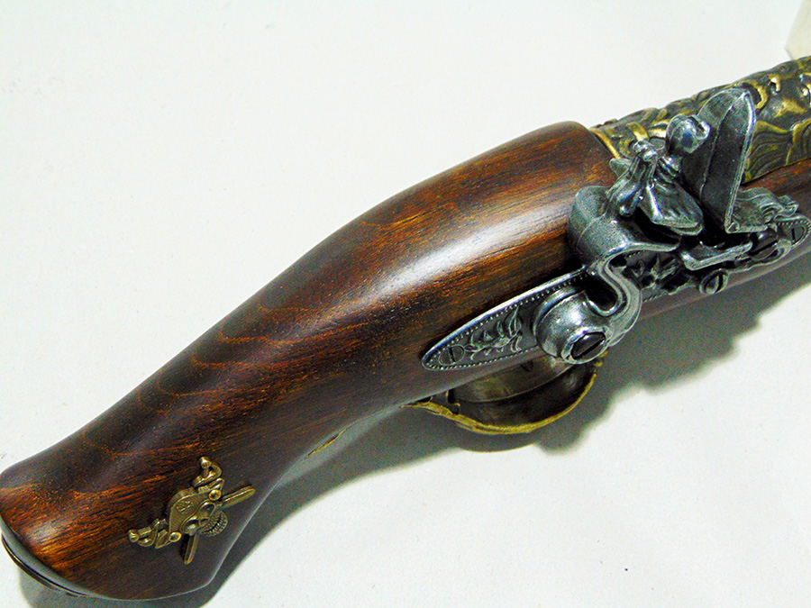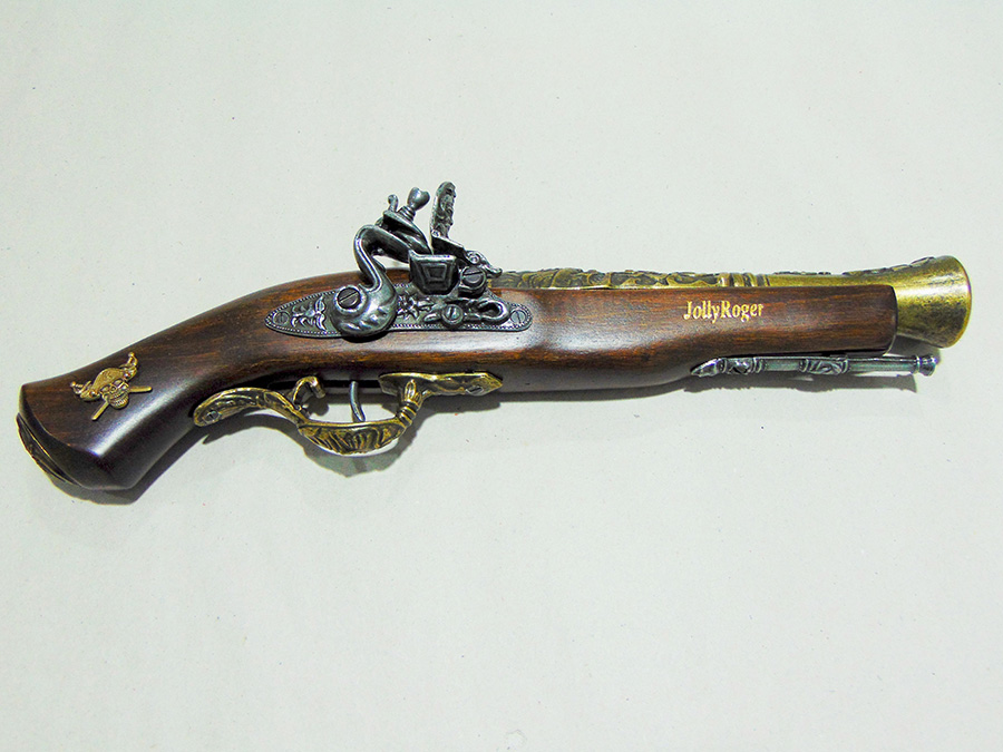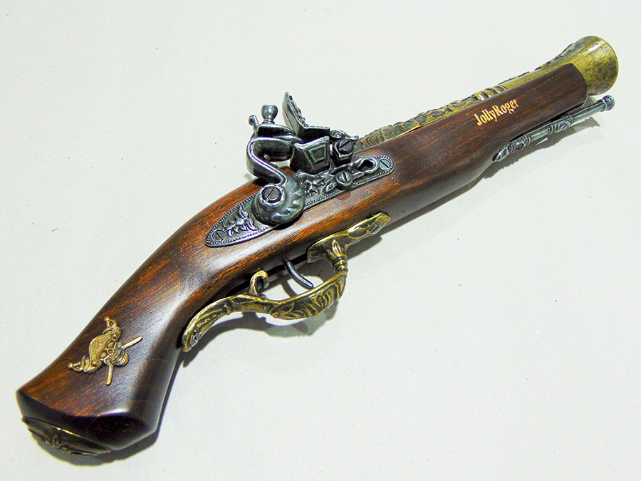 Működő mechanikával rendelkező díszpisztoly. Anyaga fa és fémötvözet. A pisztolyhoz vásárolható Jolly Roger-motívumos fegyvertartó is fekete színben, ára: 8000 Ft.