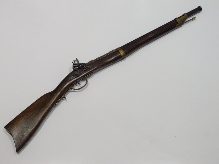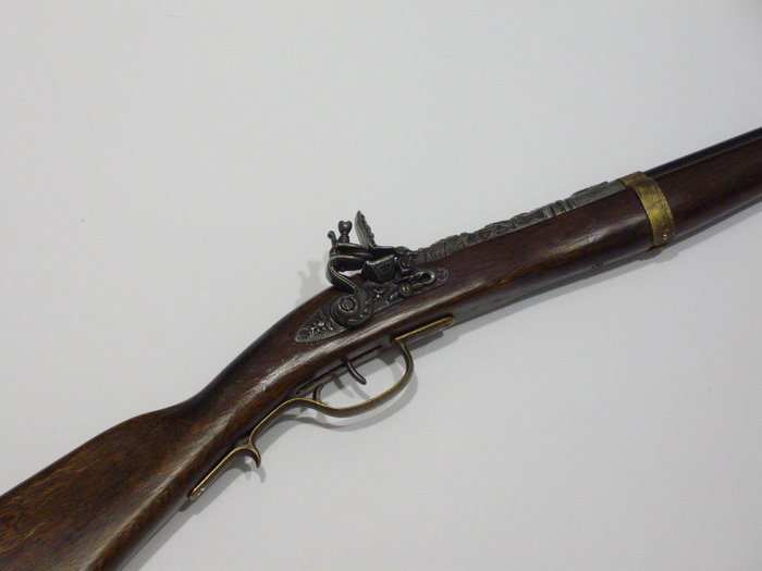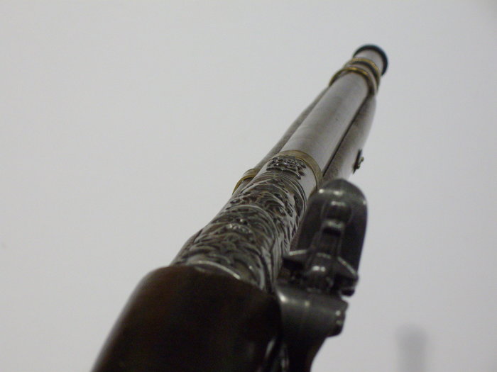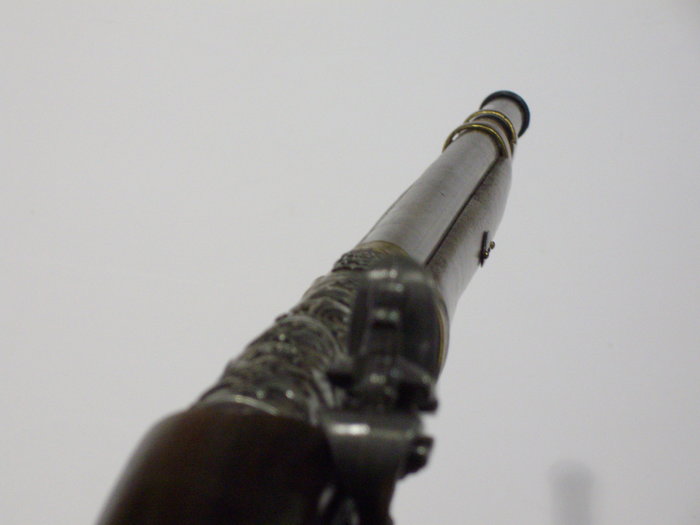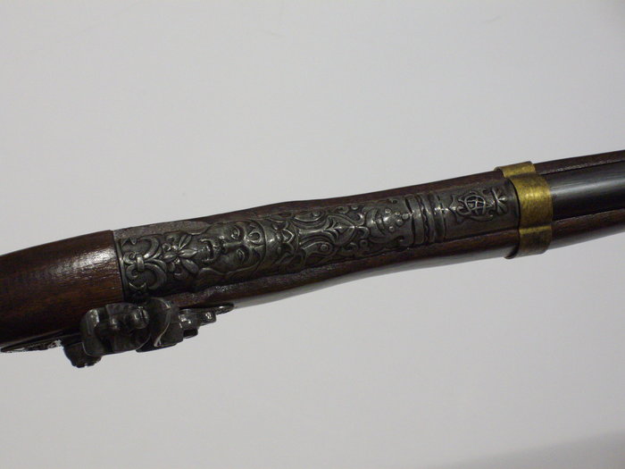 Működő mechanikával ellátott kovás lakatszerkezetű díszpuska. A puskacső gazdagon díszített.