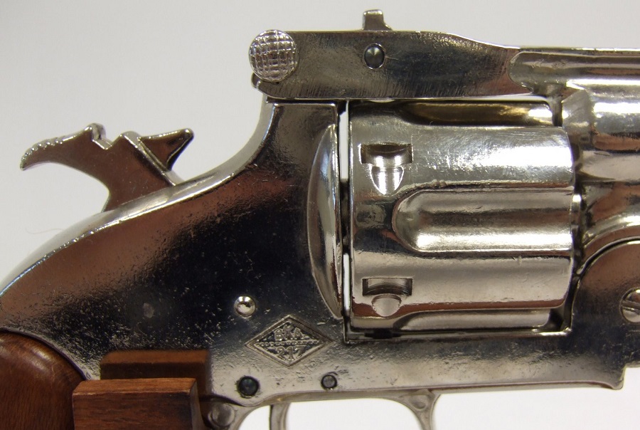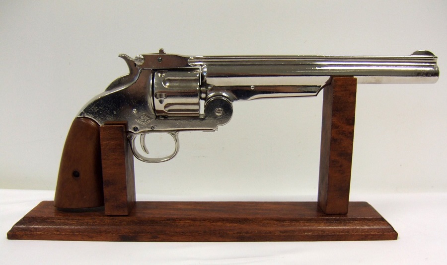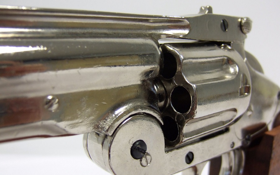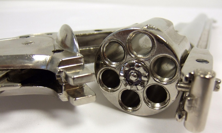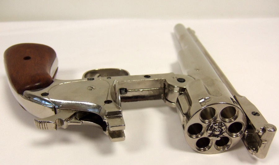 Lehajtható csövű, 45-ös kaliberű fegyver másolata krómozott fémötvözetből, fa markolatborítással.