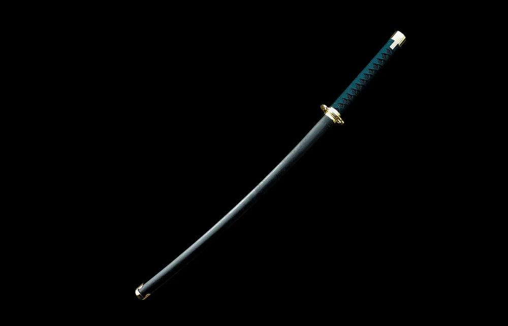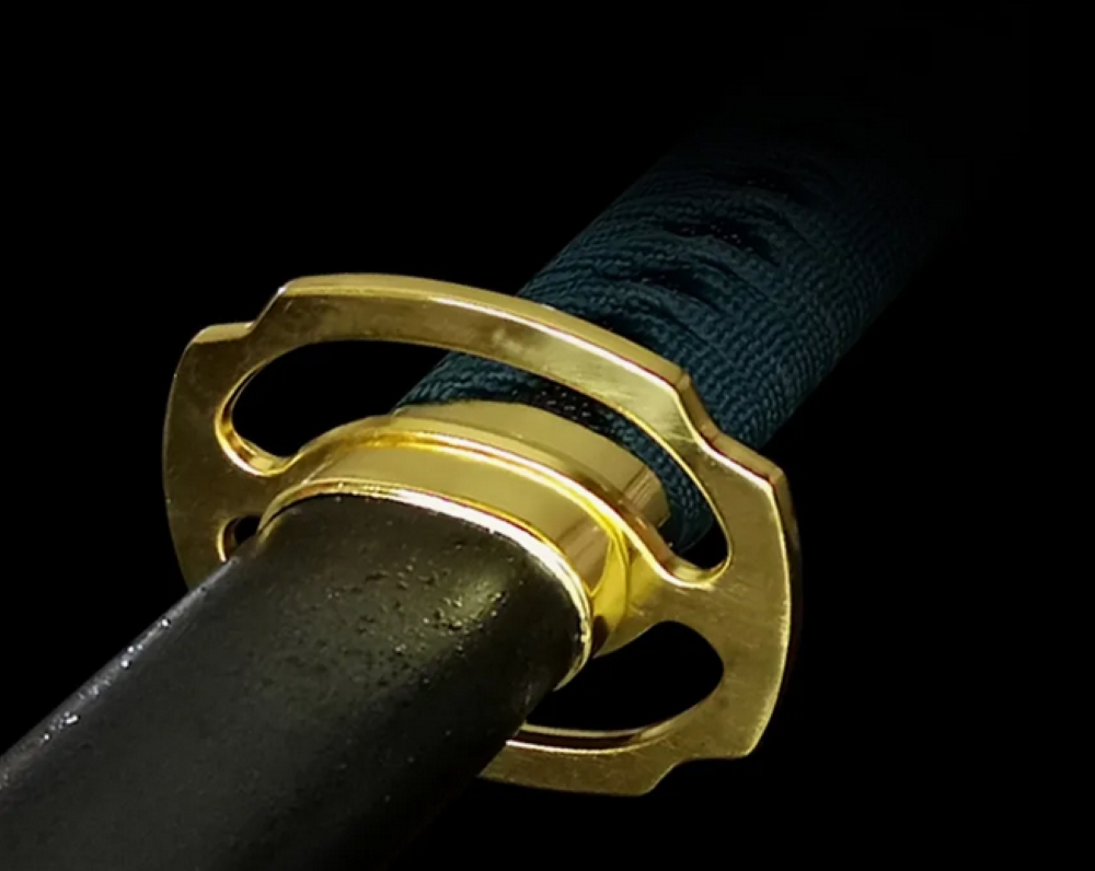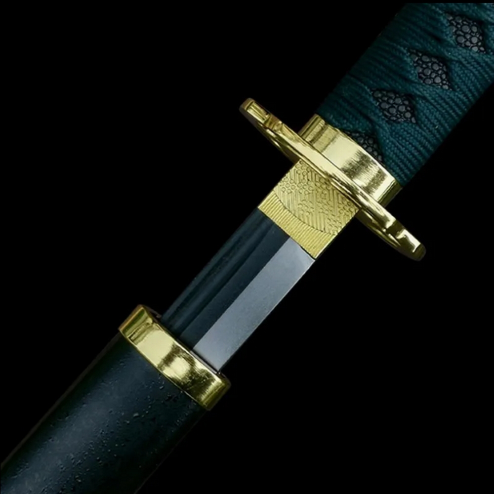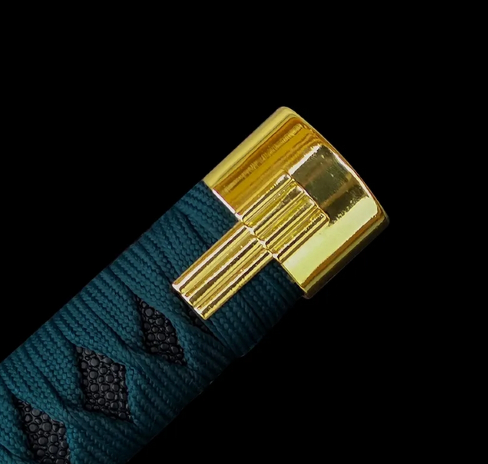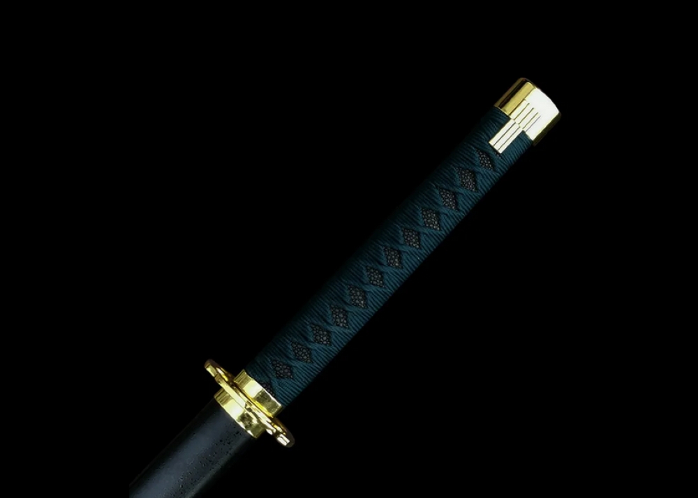 Festett acélpengével készült díszkatana, a saya (hüvely) anyaga keményfa, a szerelék cink-alumínium öntvény.