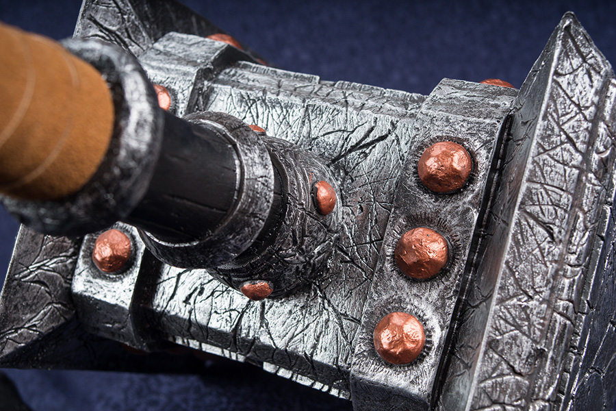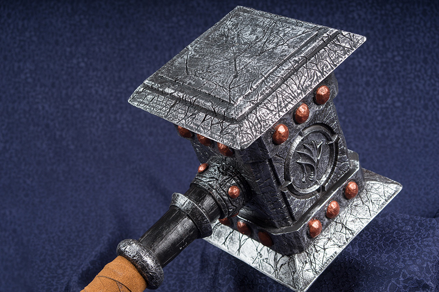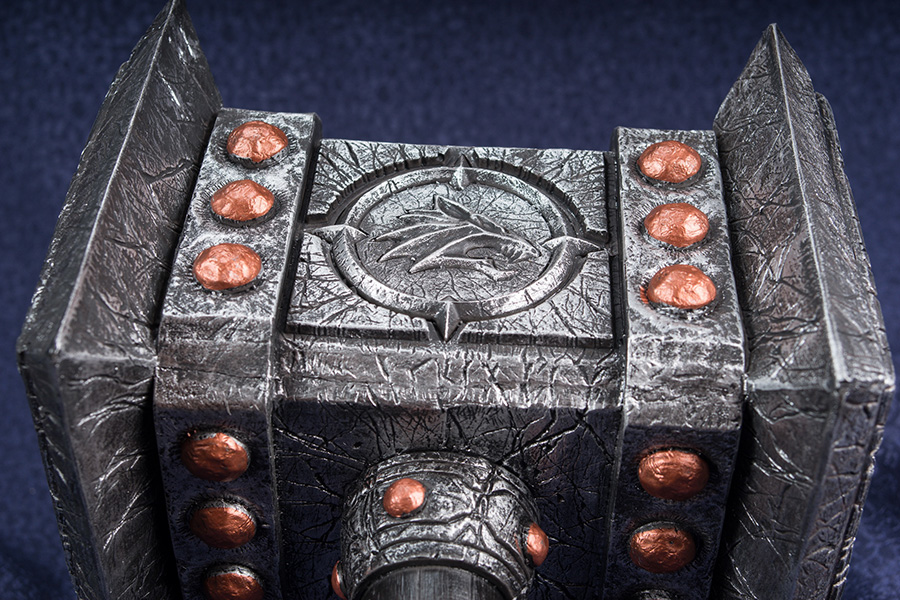 A számítógépes játékban szereplő pöröly másolata műgyantából készül, kézzel festett, súlya 2750 gramm.