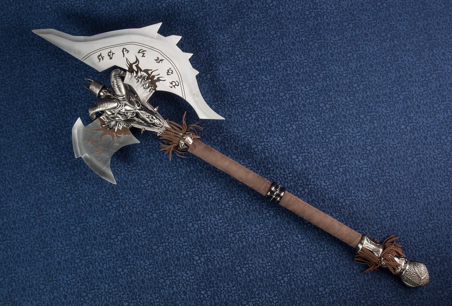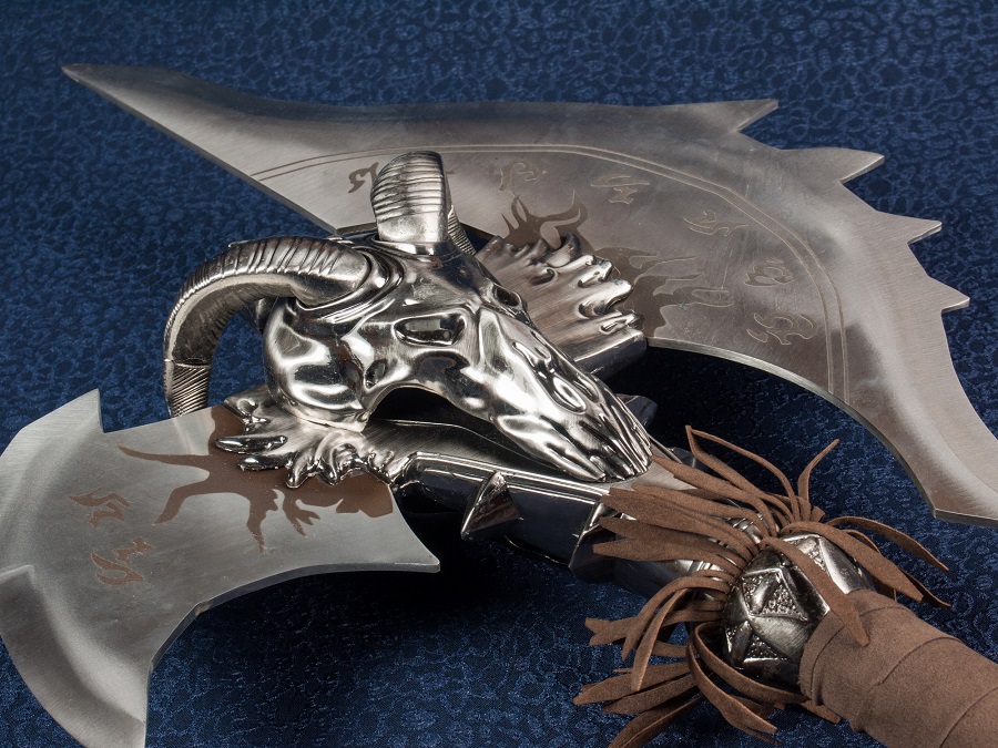 A díszbárd anyaga fa és fémötvözet, a kétélű penge rozsdamentes acél. Az ár tartalmazza a képen látható festett falitartót.