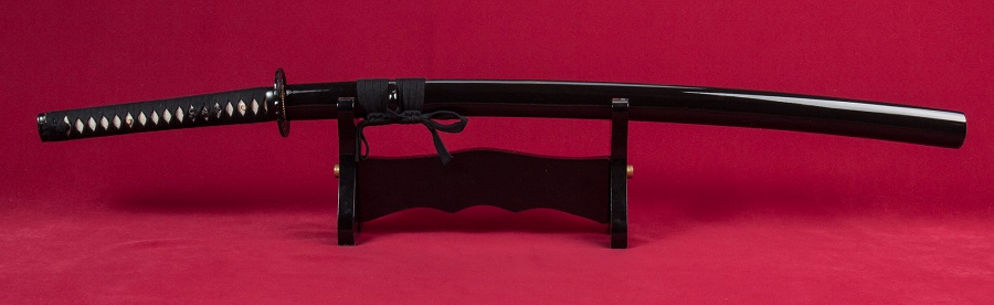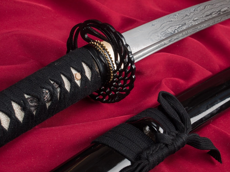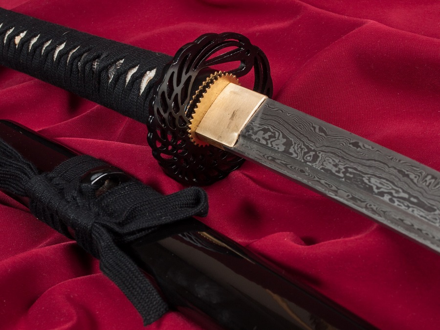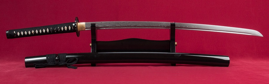 A katana pengéje 1060 típusú szénacélból készült, rétegelt kovácsolással (damaszkolás). A vércsatornával könnyített kardpenge élezett, a tsuba anyaga festett acél.